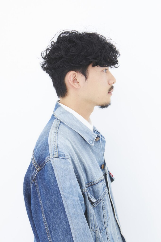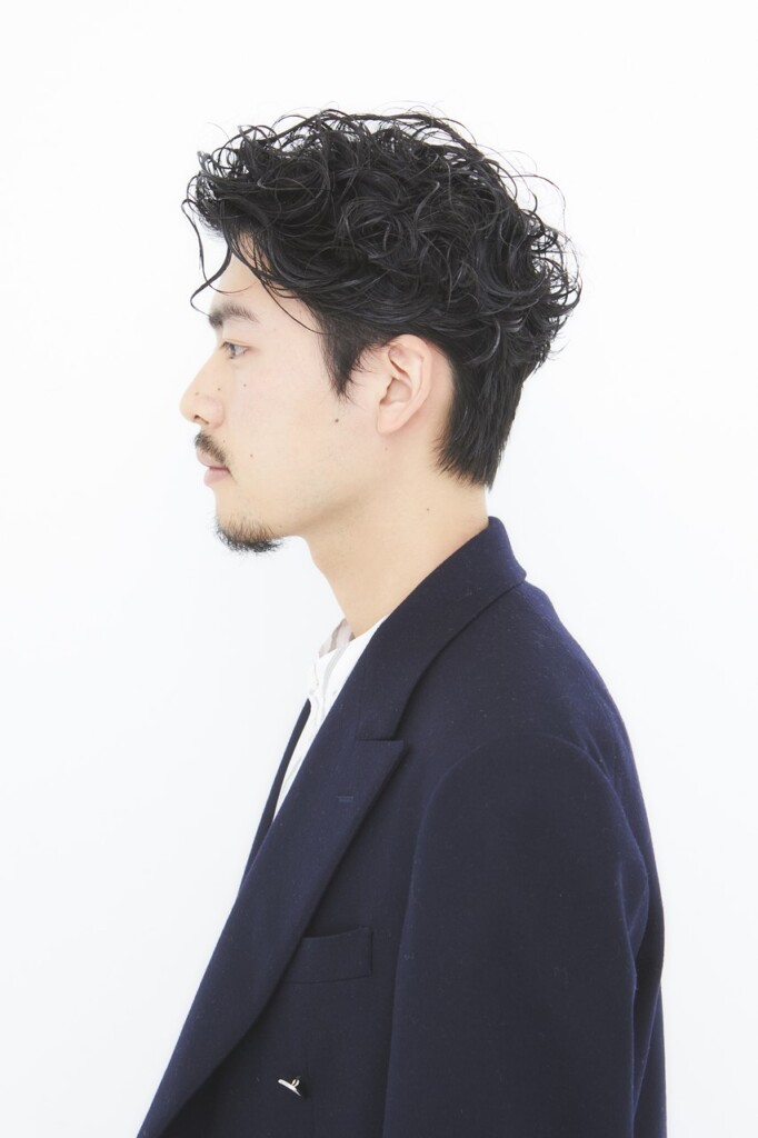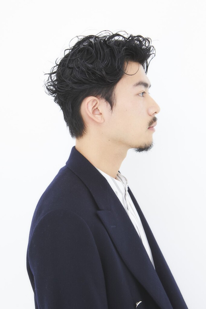 人気のセンターパートアレンジもミックスパーマのおかげで簡単。黒髪の男らしさとこのグロッシーな束感が好相性すぎるのも見ての通り。目元にハラッと落として色香を堪能したい。