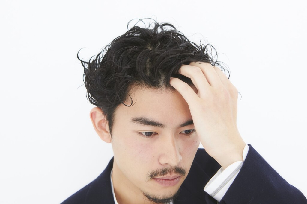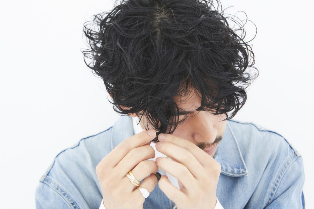 パーマの質感を生かすようにフォームとバームでスタイリング。前髪は手のひらで包み込むようにして握り、繊細な束感に仕上げる。