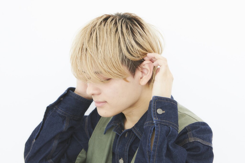 サイドからのシャープな前下がりラインとブツプツとした毛先のニュアンスが外国人風のセンターパートスタイル。根元に残した地毛の黒が効き、ハイトーンの毛束の動きを強調。