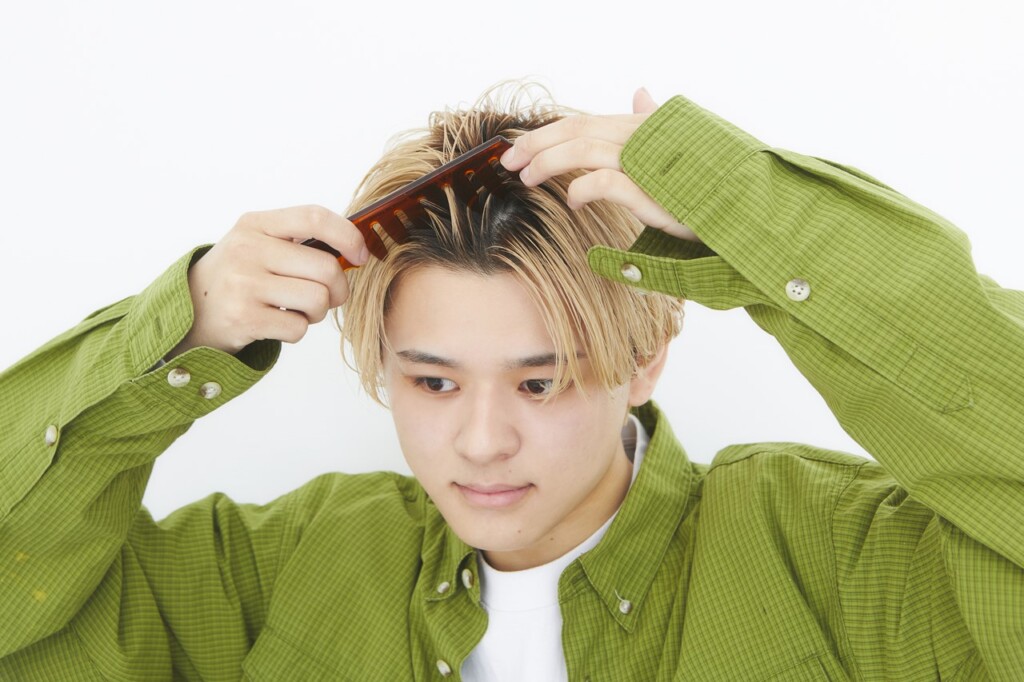 立ち上がりやラフな動きを作るにはメッシュコームが便利。グリースを全体になじませ、センターの根元を前から後ろへコームを通す。