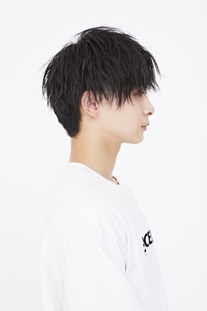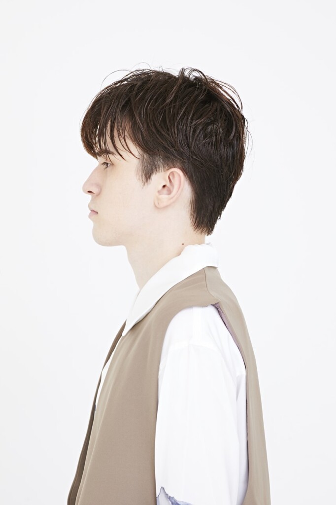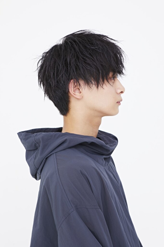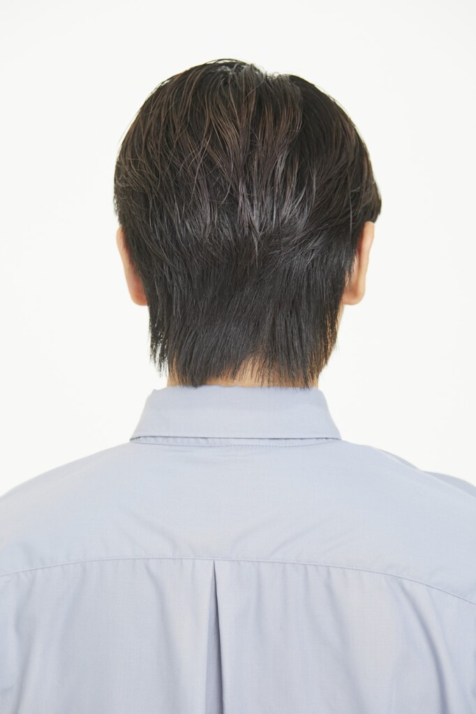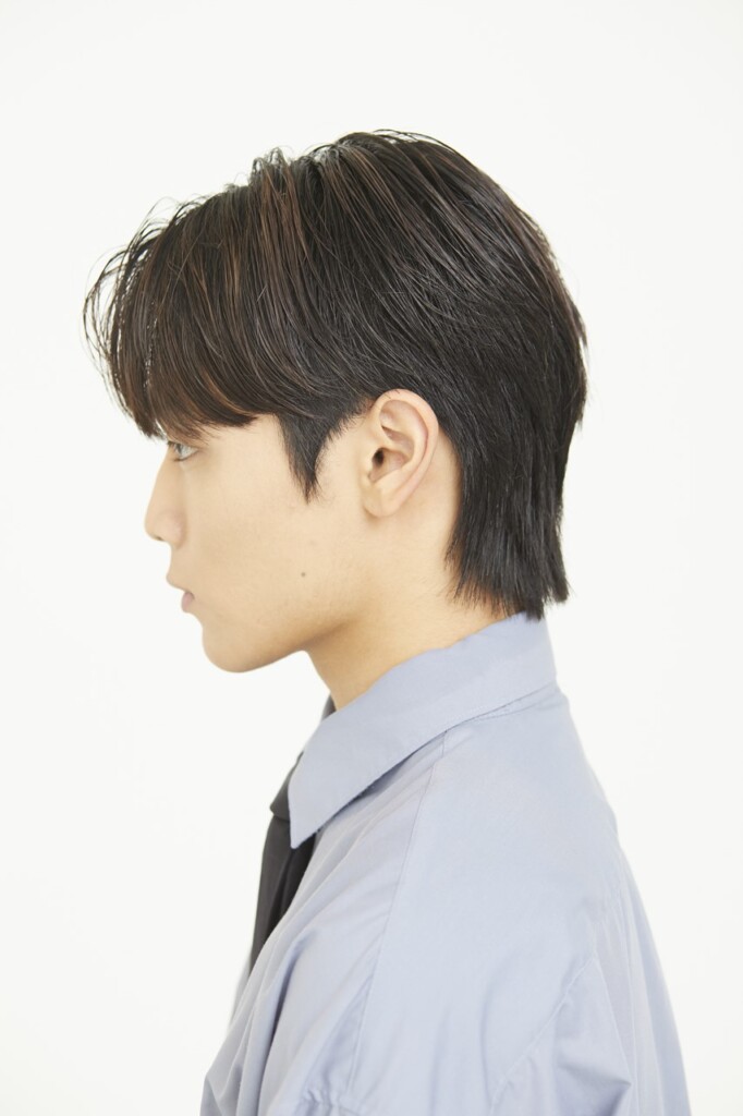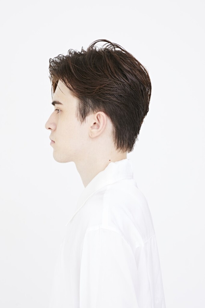 マッシュウルフはそれだけで今を堪能できるが、さらに前髪の透け感で最先端のムードが加速。トップのマッシュの根元を起こすようにスタイリングして全体の空気感をアップ。えり足は上から押さえてタイトになでつけることでメリハリを効かせる。シースルーバングにするため、前髪の上にかぶさる部分の根元を立ち上げてスプレーをオン。