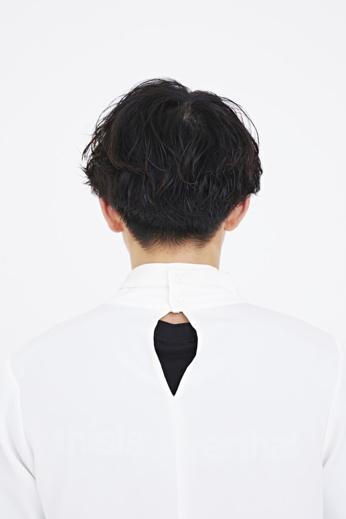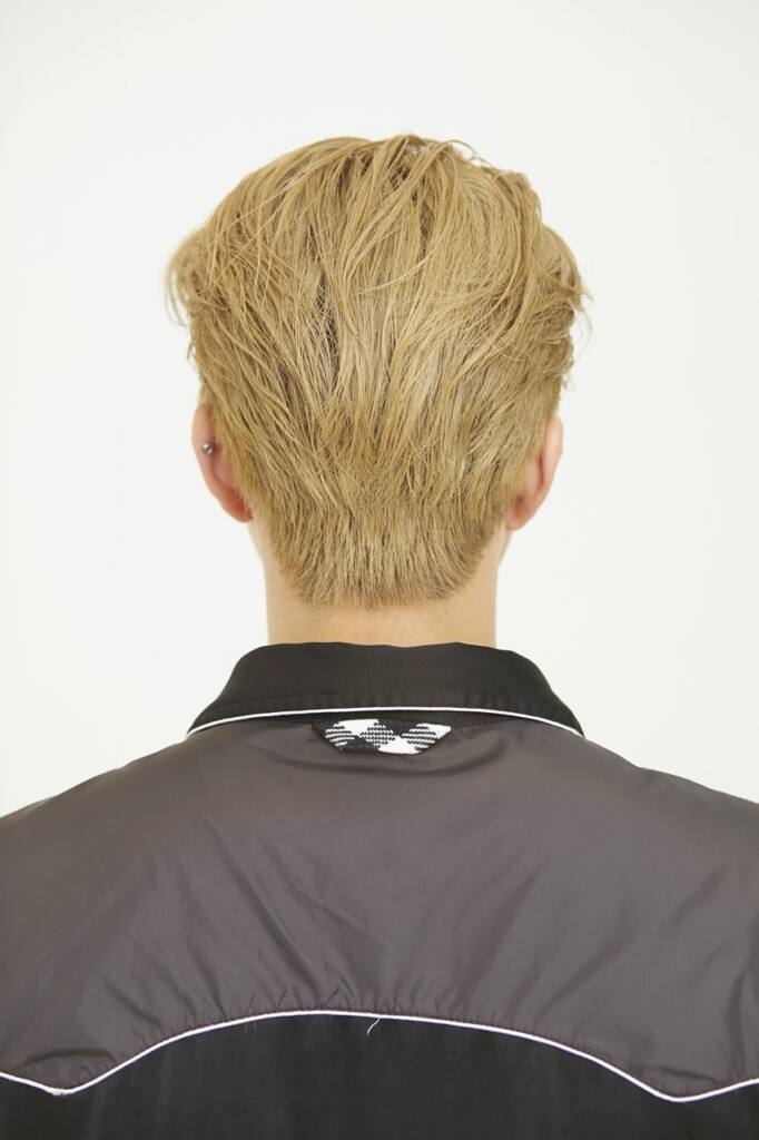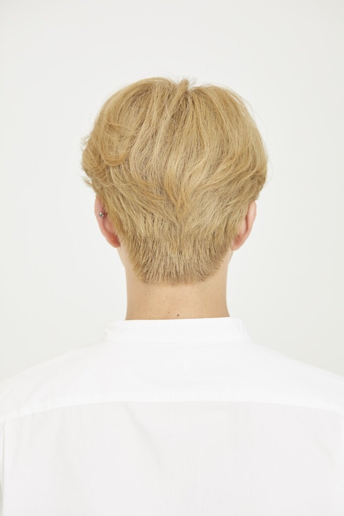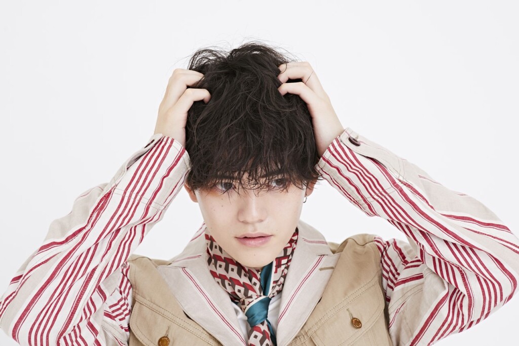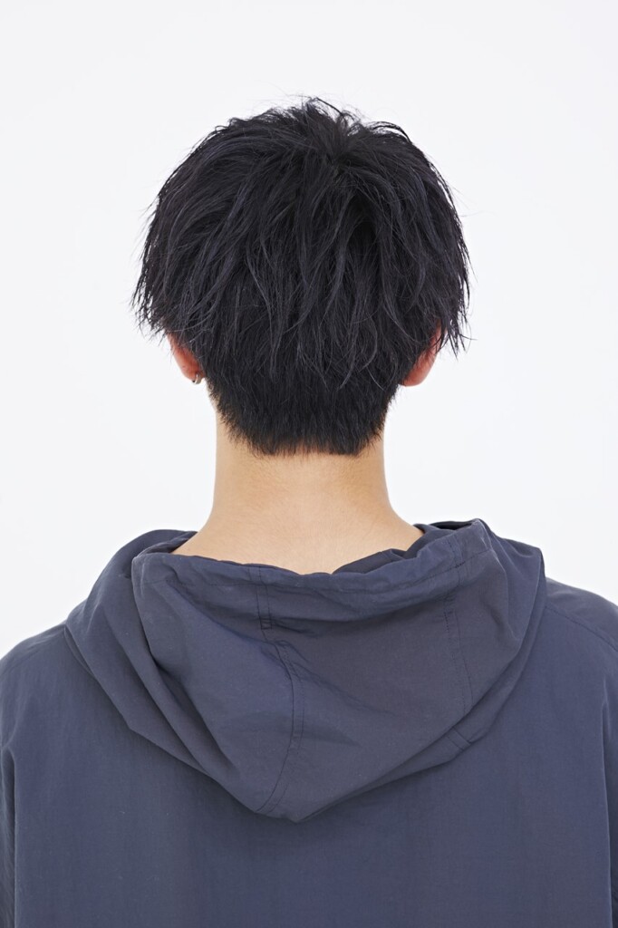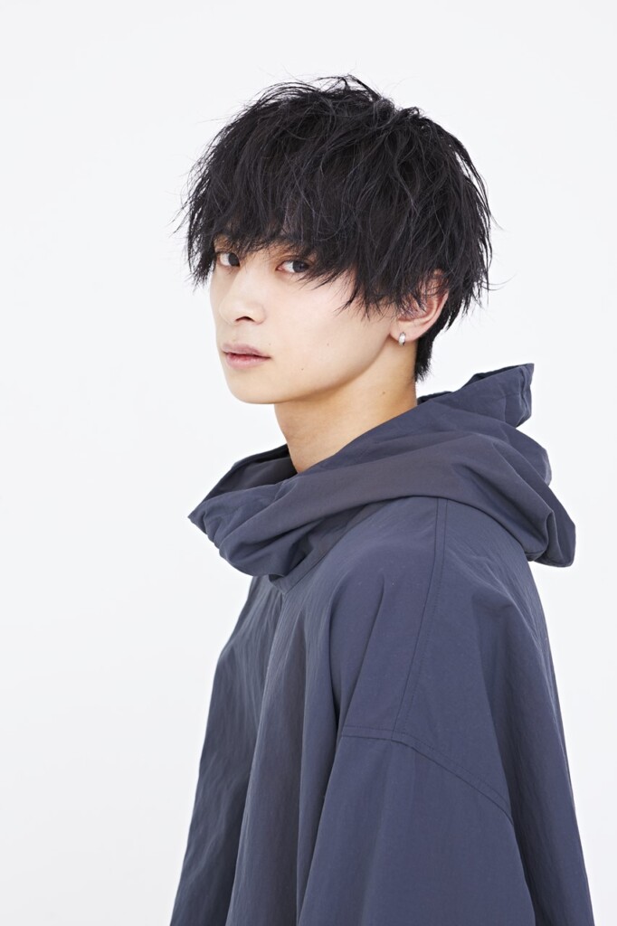 マッシュウルフはそれだけで今を堪能できるが、さらに前髪の透け感で最先端のムードが加速。トップのマッシュの根元を起こすようにスタイリングして全体の空気感をアップ。えり足は上から押さえてタイトになでつけることでメリハリを効かせる。シースルーバングにするため、前髪の上にかぶさる部分の根元を立ち上げてスプレーをオン。