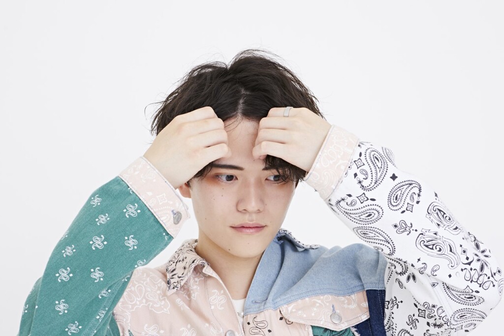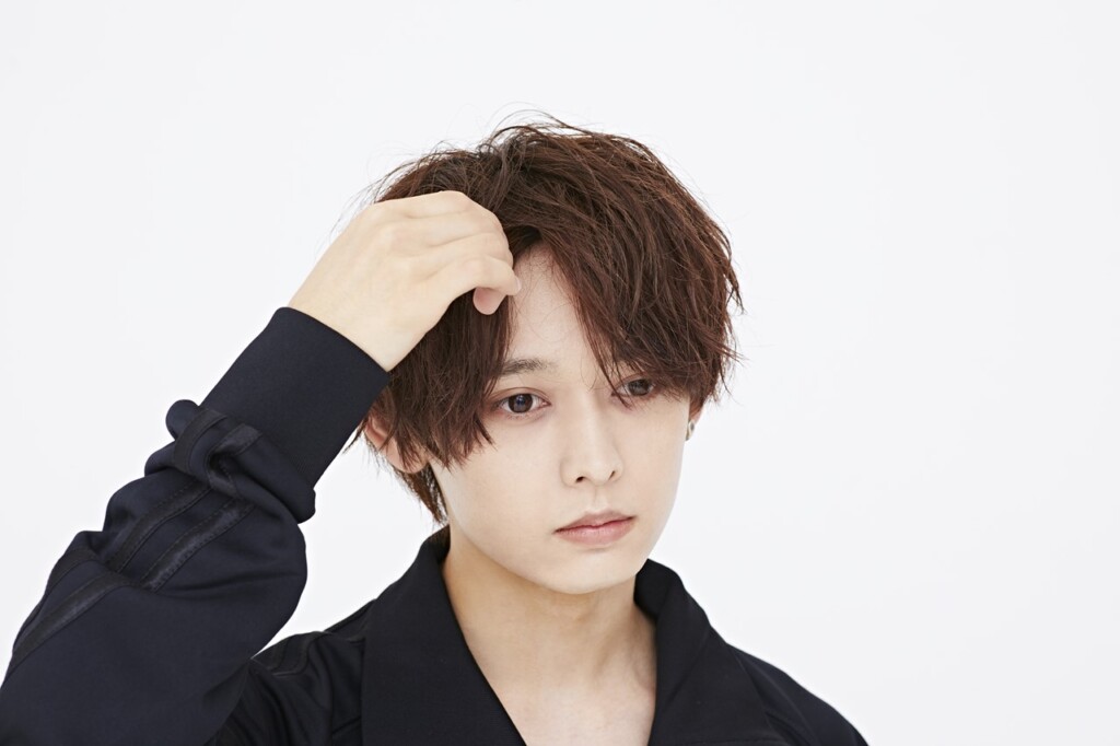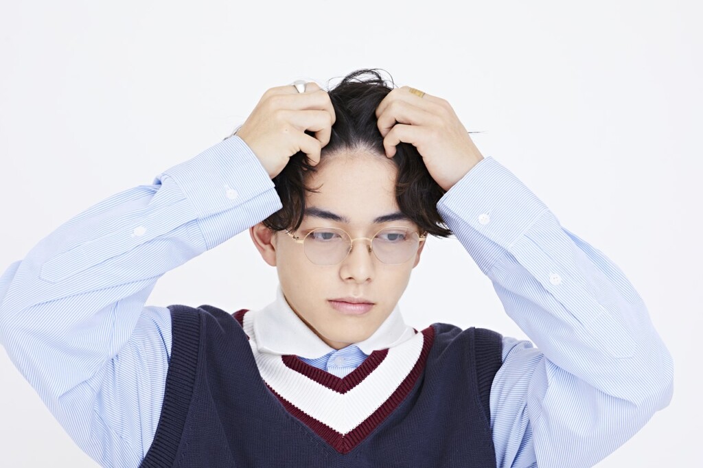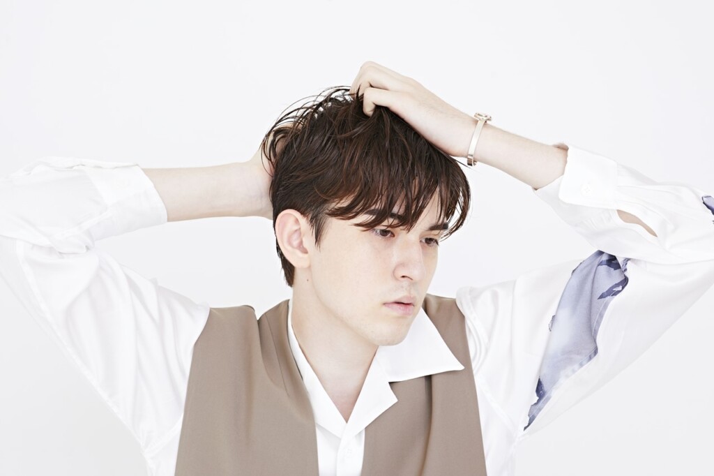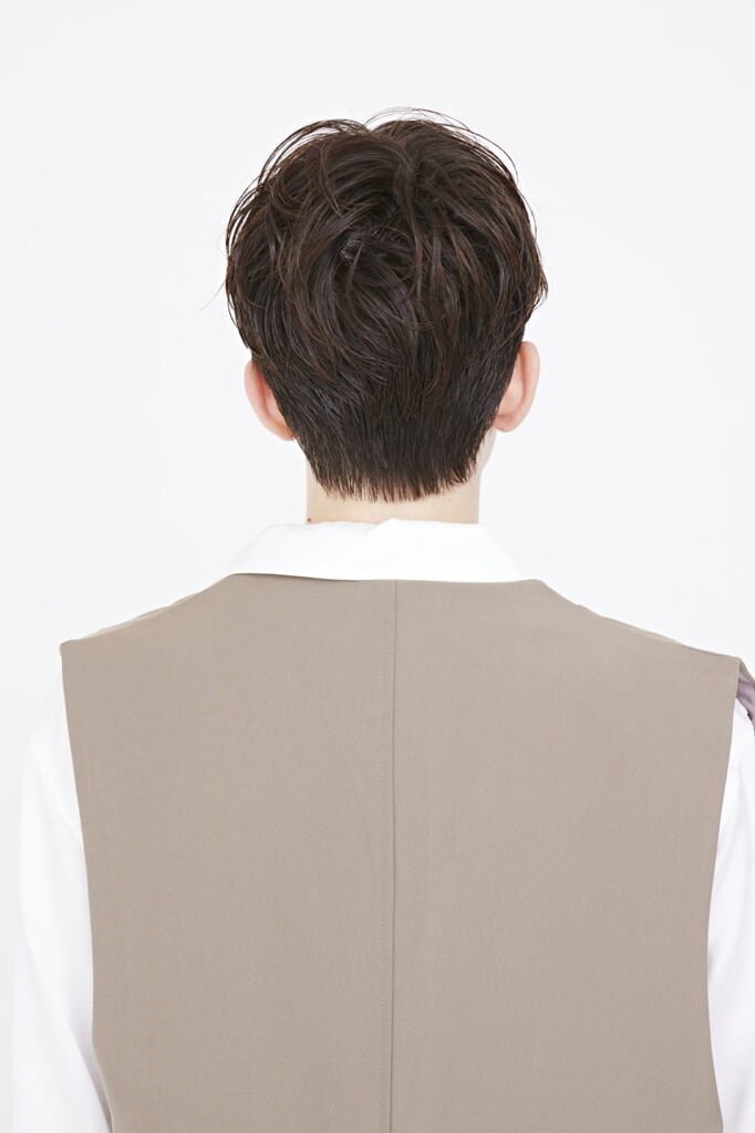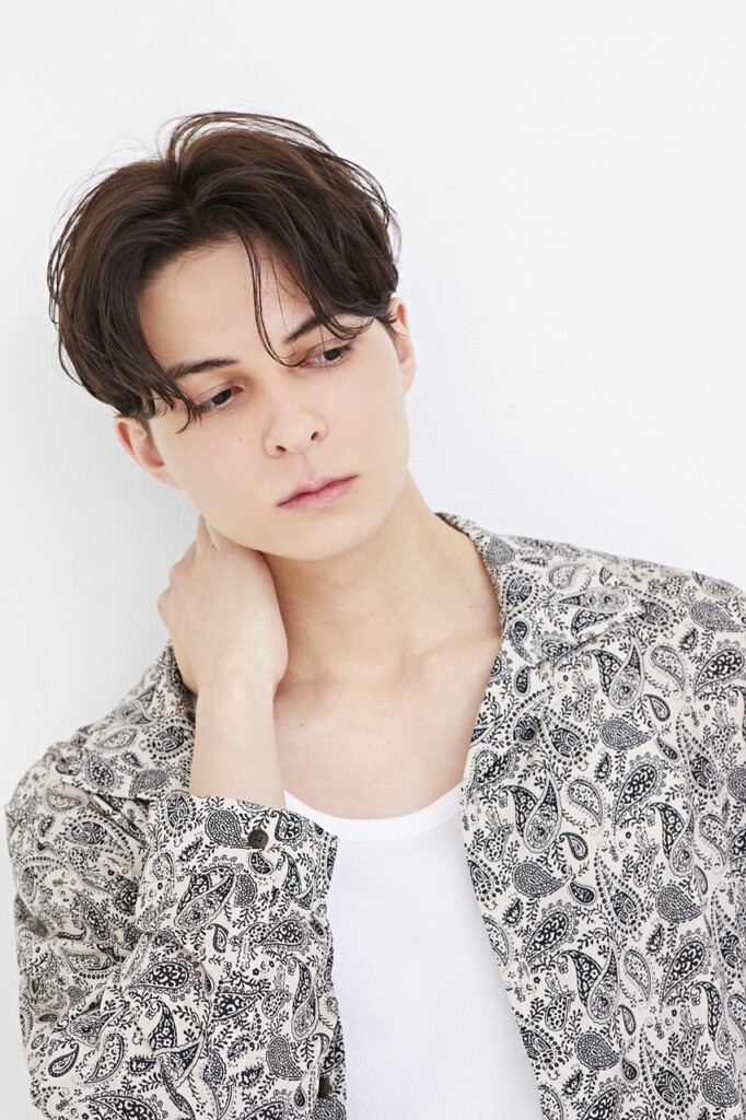 マッシュウルフはそれだけで今を堪能できるが、さらに前髪の透け感で最先端のムードが加速。トップのマッシュの根元を起こすようにスタイリングして全体の空気感をアップ。えり足は上から押さえてタイトになでつけることでメリハリを効かせる。シースルーバングにするため、前髪の上にかぶさる部分の根元を立ち上げてスプレーをオン。