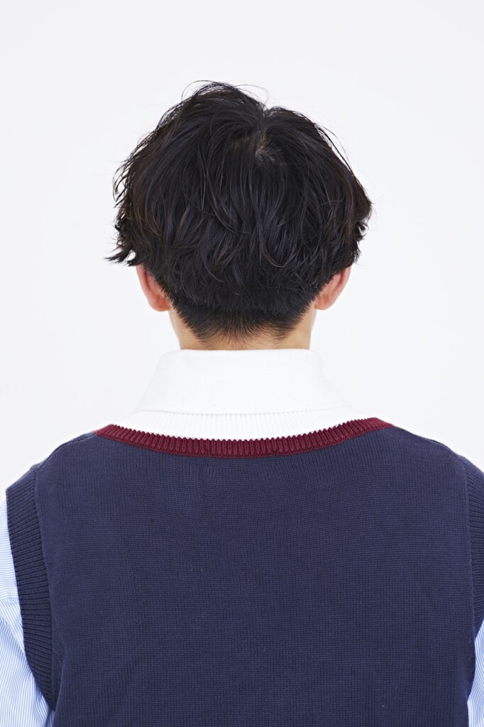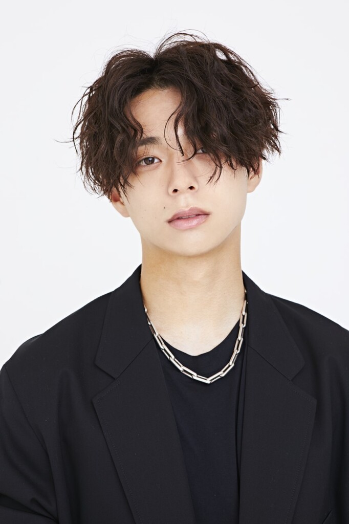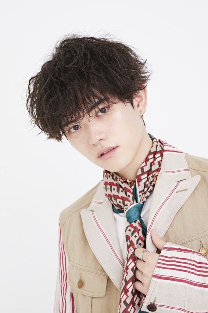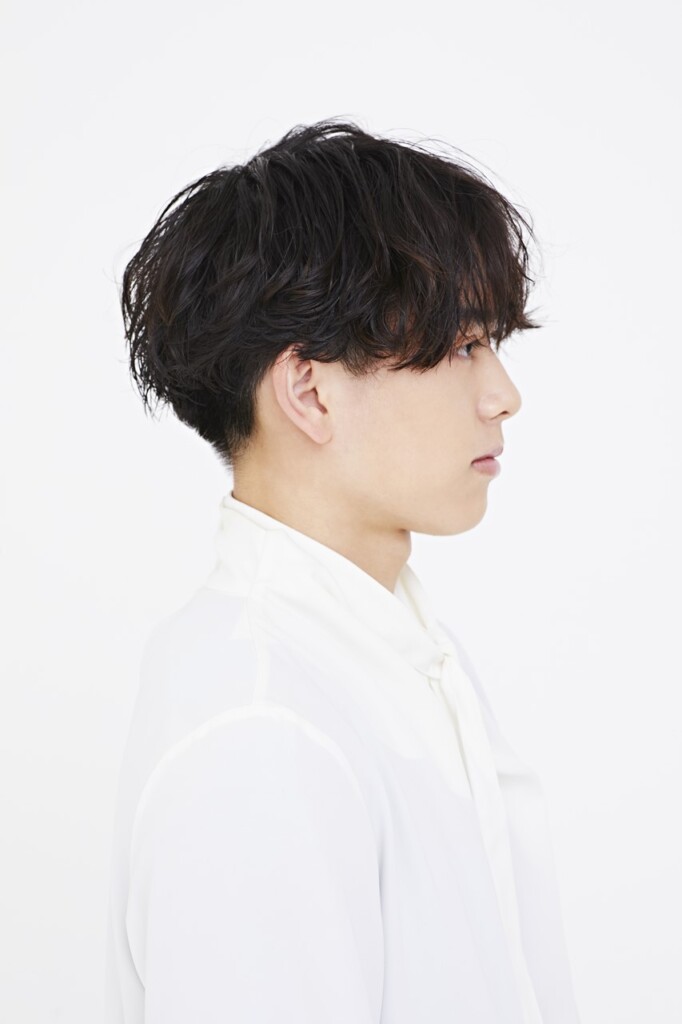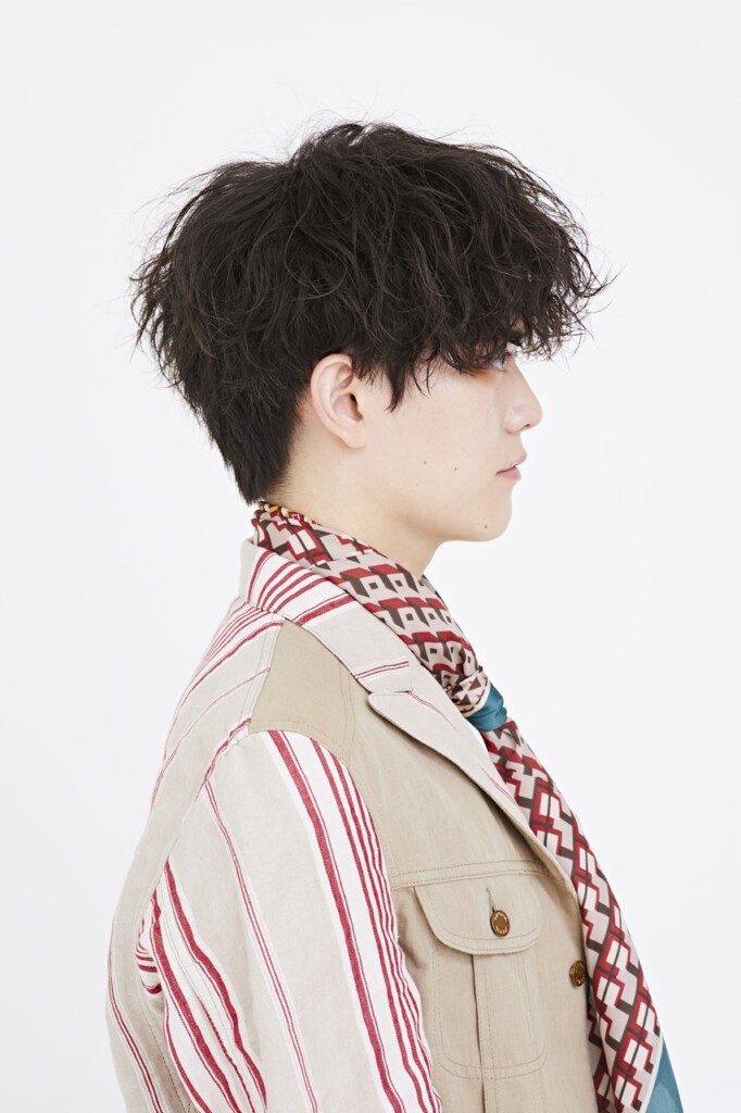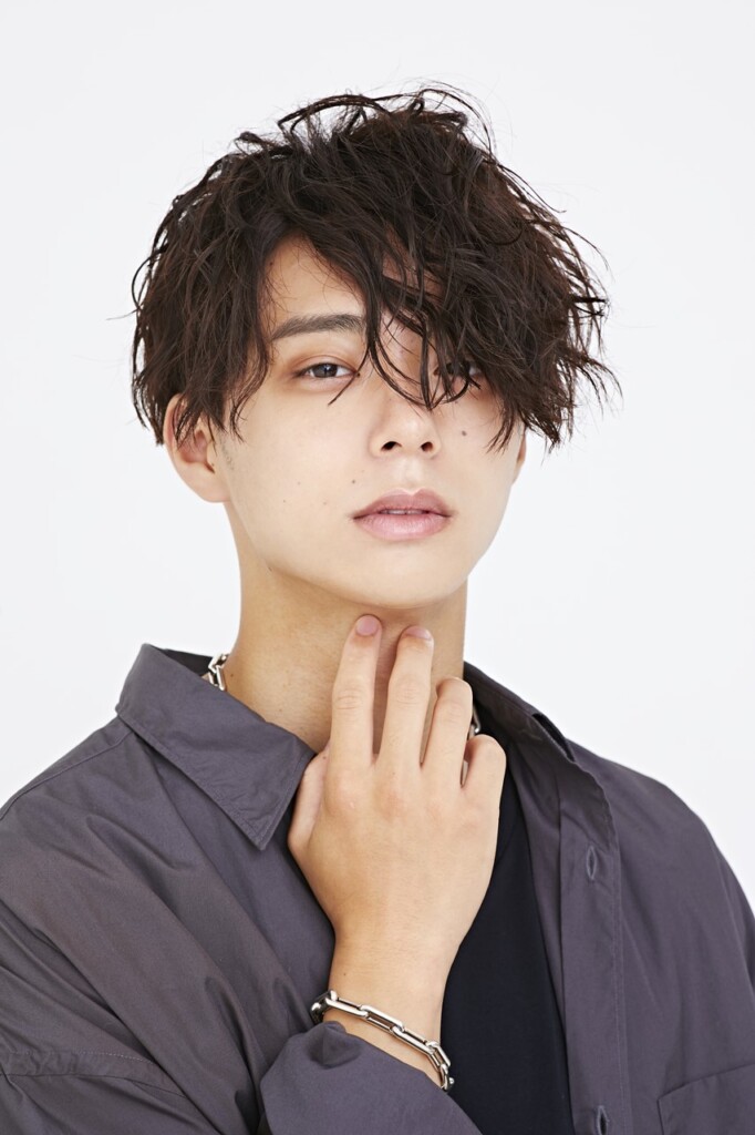 ゆるめの波打ちウェーブとシースルーバングが最大ポイント。ミディアムハードワックスを中間~毛先メインにもみ込み、カール感を調整。束感をつくり込みすぎず、パーマの質感を存分に生かし、もみ込みながらウェーブを調整する。