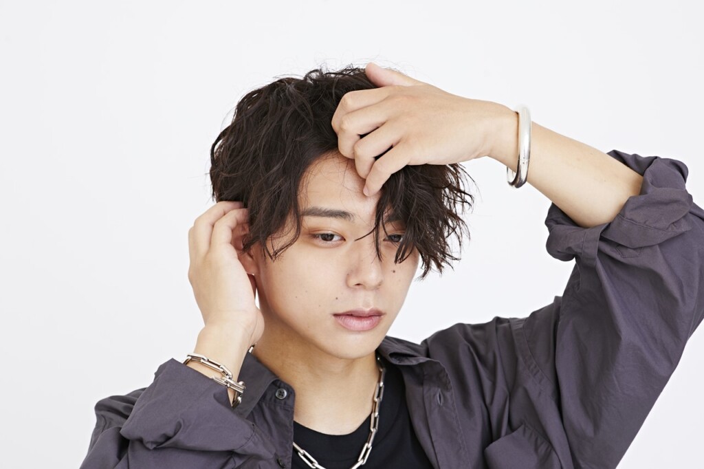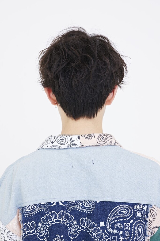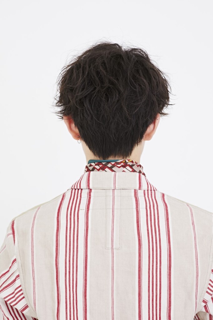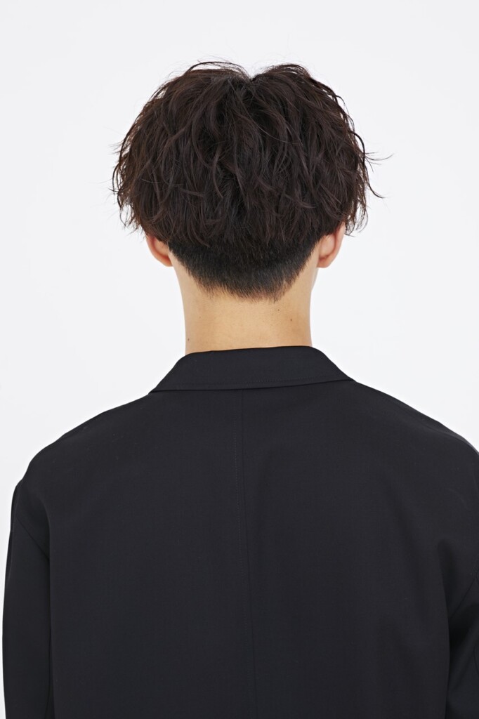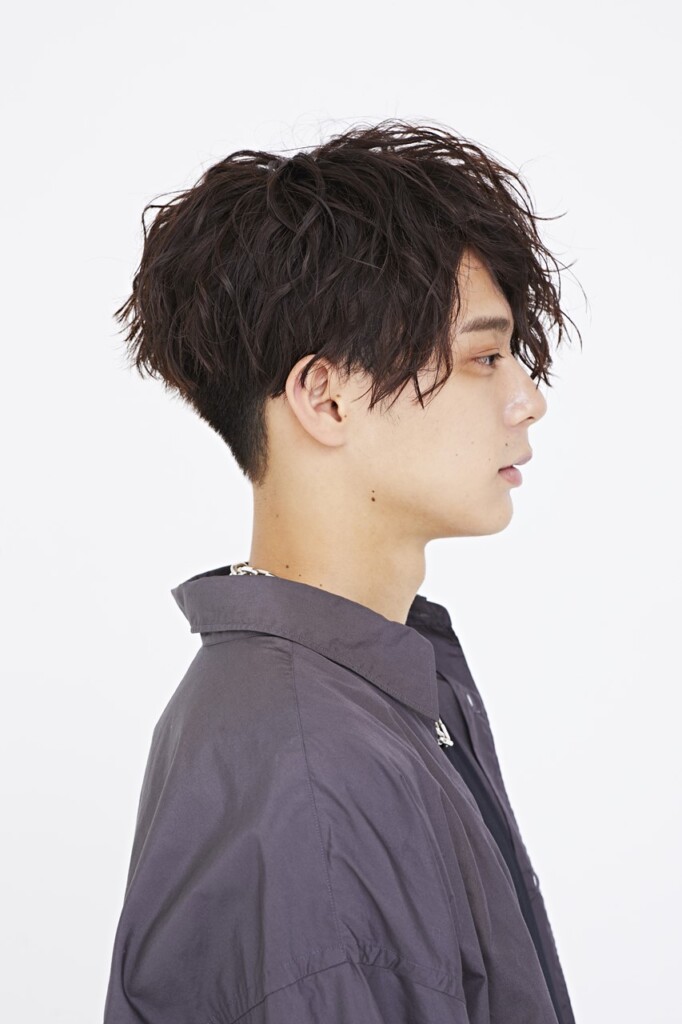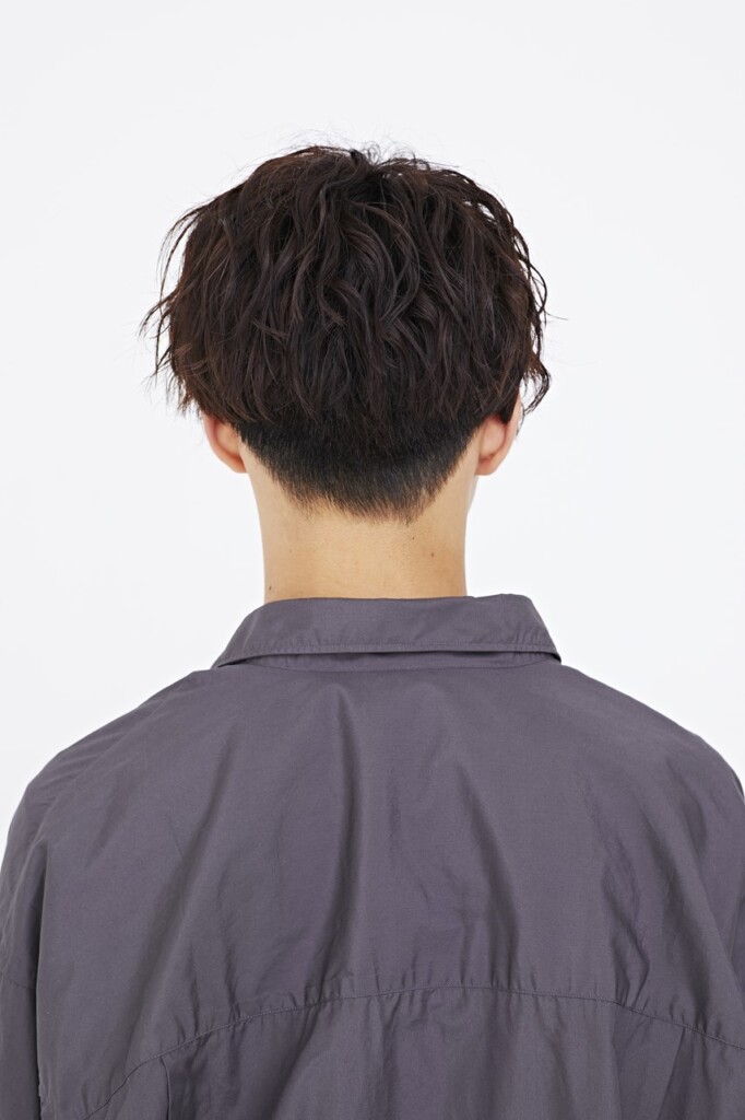 ほどよい長さのえり足が鮮度抜群なコリアンウルフ。アイロンで全体をラフなスパイラル巻きにし、サイドはハネさせる。マットワックスをもみ込んだら、毛先のみバームをなじませ、ツヤっぽさをプラスする。