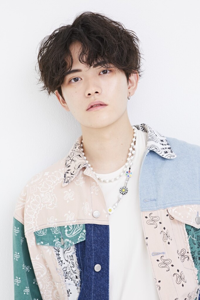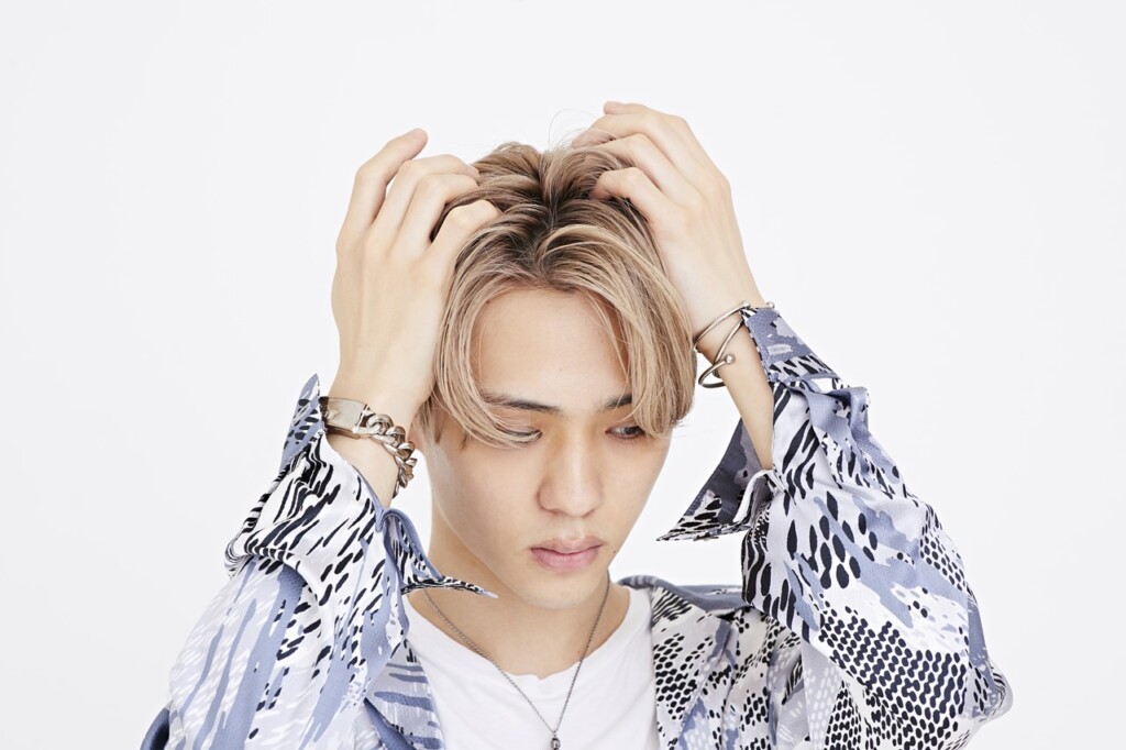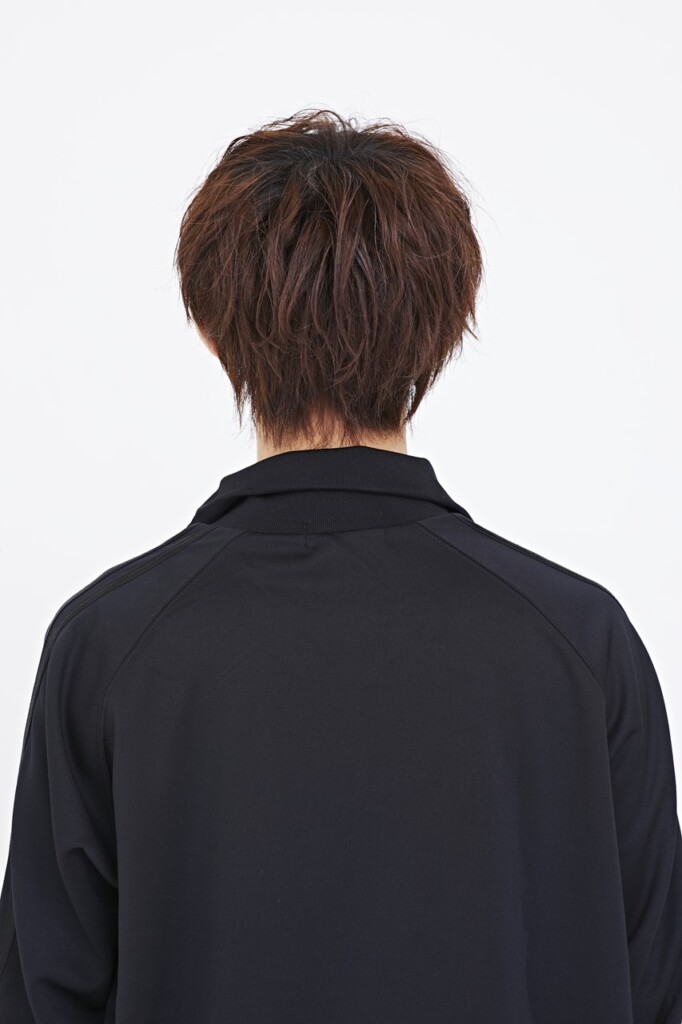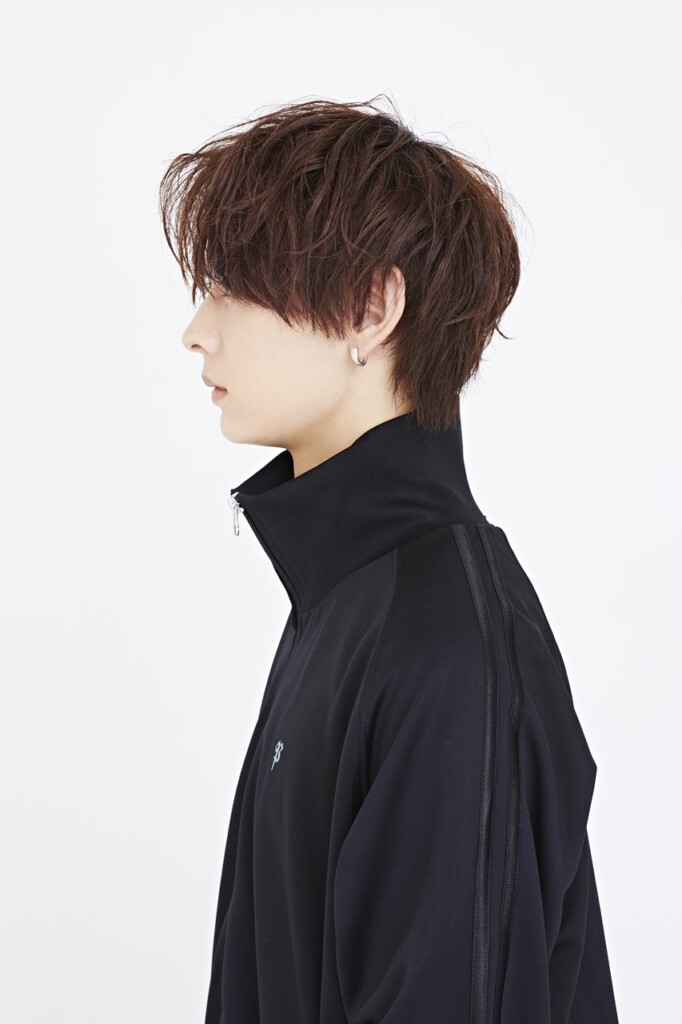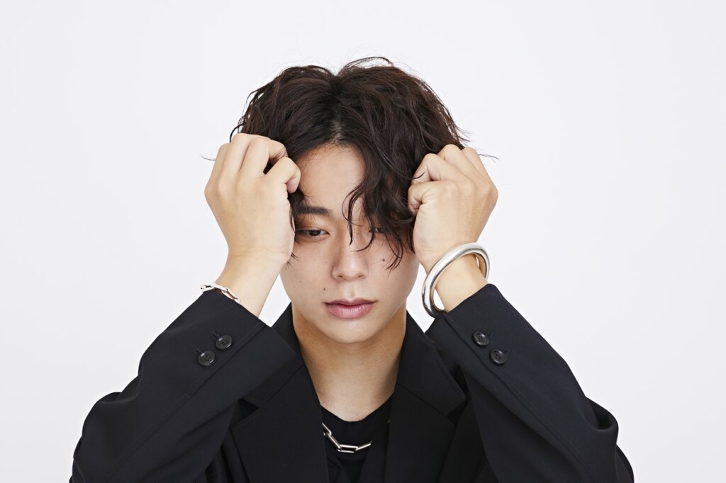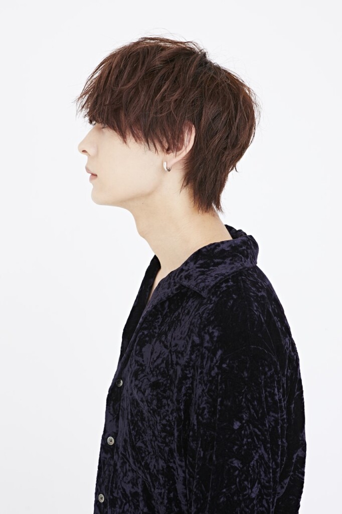 ほどよい長さのえり足が鮮度抜群なコリアンウルフ。アイロンで全体をラフなスパイラル巻きにし、サイドはハネさせる。マットワックスをもみ込んだら、毛先のみバームをなじませ、ツヤっぽさをプラスする。