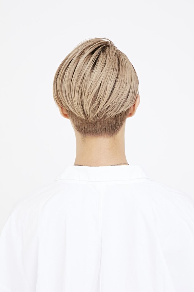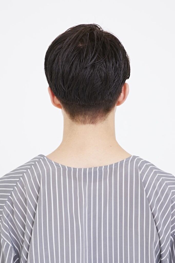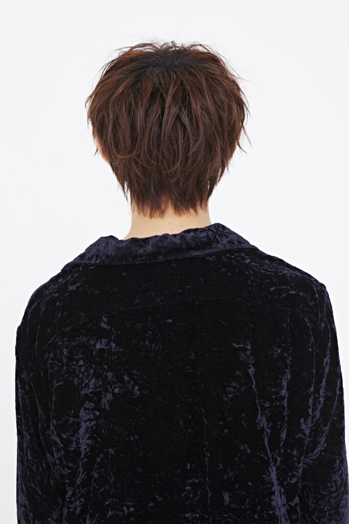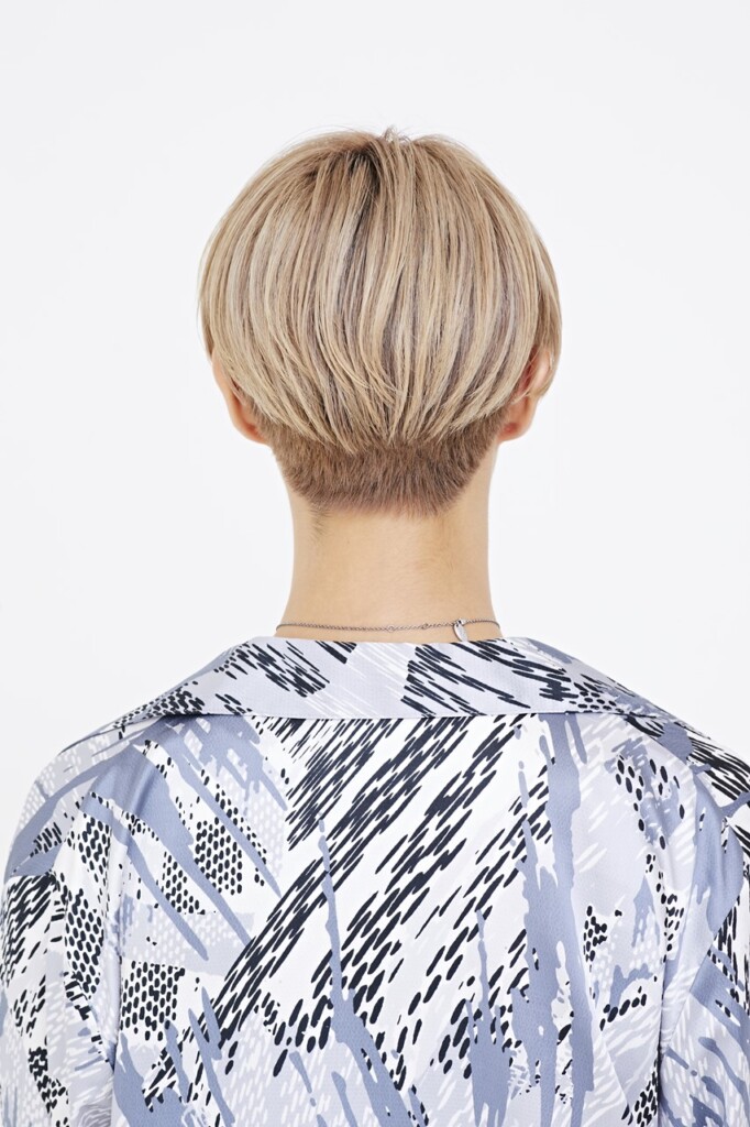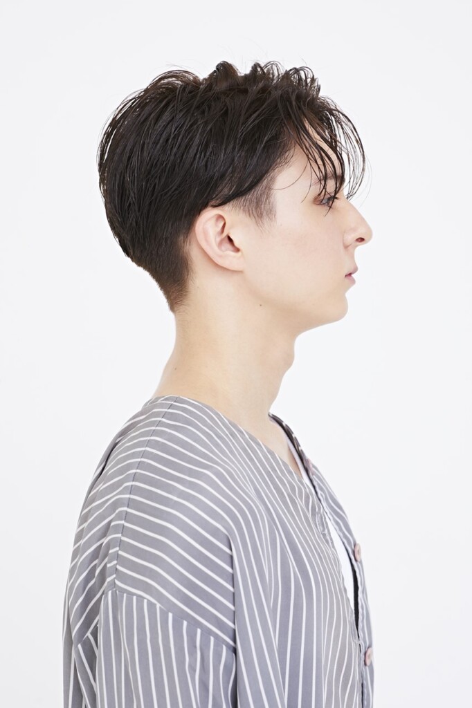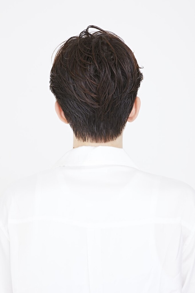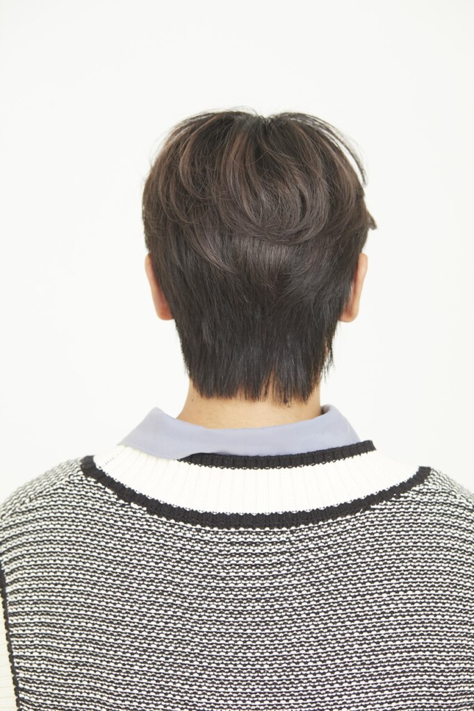 長めに残したトップをリーゼント風にかき上げたショート。ジェルとシアバターを同量混ぜたものをなじませてウェットな質感に。バングは根元からリバース方向に一気にかき上げてリーゼント風に調整。少量毛束を下ろしてコンマっぽい束感に。