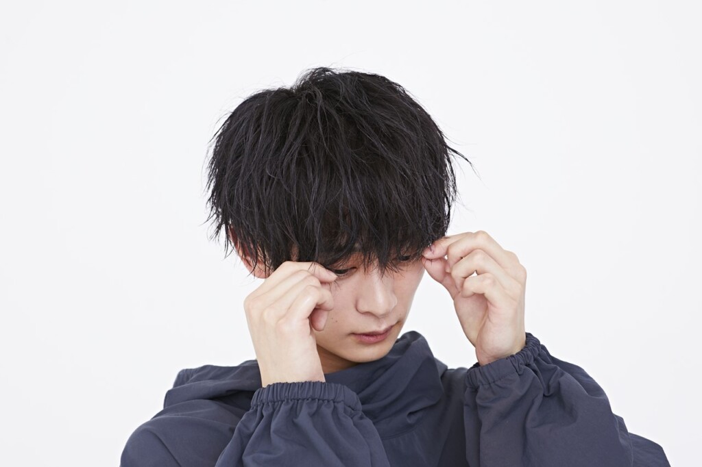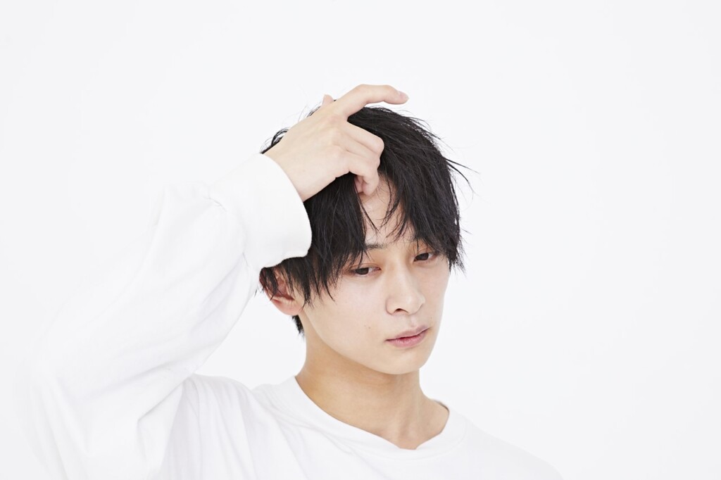 シースルーバングをラフに分け、さりげなくデコ出しに。額が少し見えることでスタイル全体に抜け感がアップし、カジュアルダウンしたファッションにもぴったり。ミディアムハードワックスを中間~毛先メインにもみ込み、カール感を調整。
