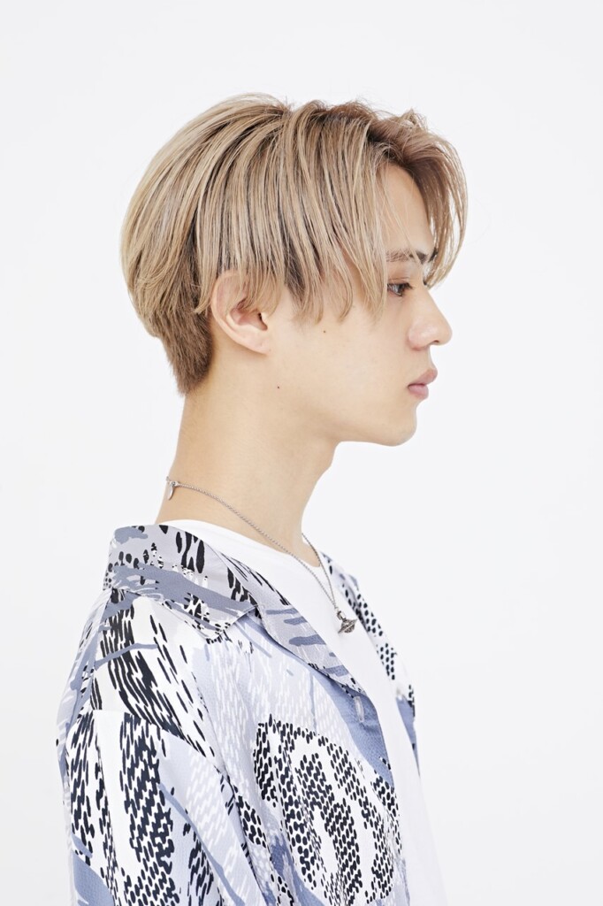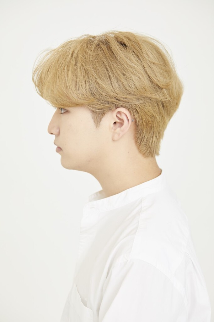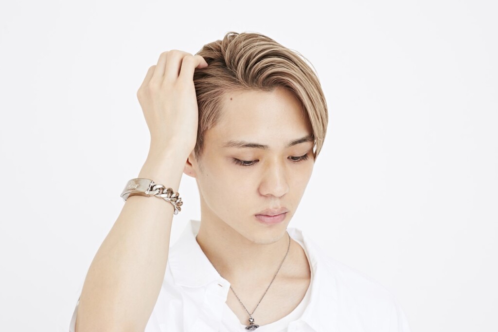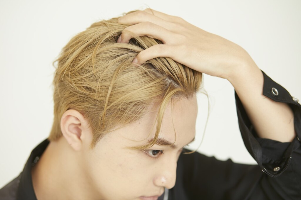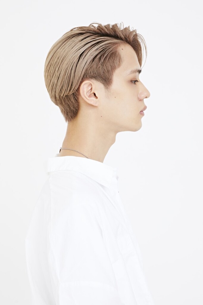 人気のハイトーンはセンターパートベースが好相性。長めのフロントは分け目を起こすように乾かして、毛先はコンマヘアになるように調整。オイルを塗布しセンターで分けたら、ふくらみやすいハチまわりを抑える。トップには高さを出して好バランスに。