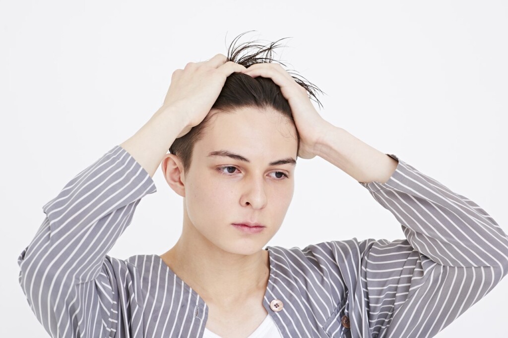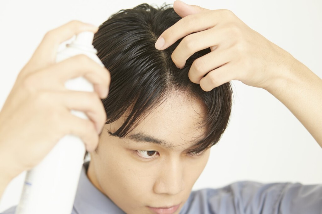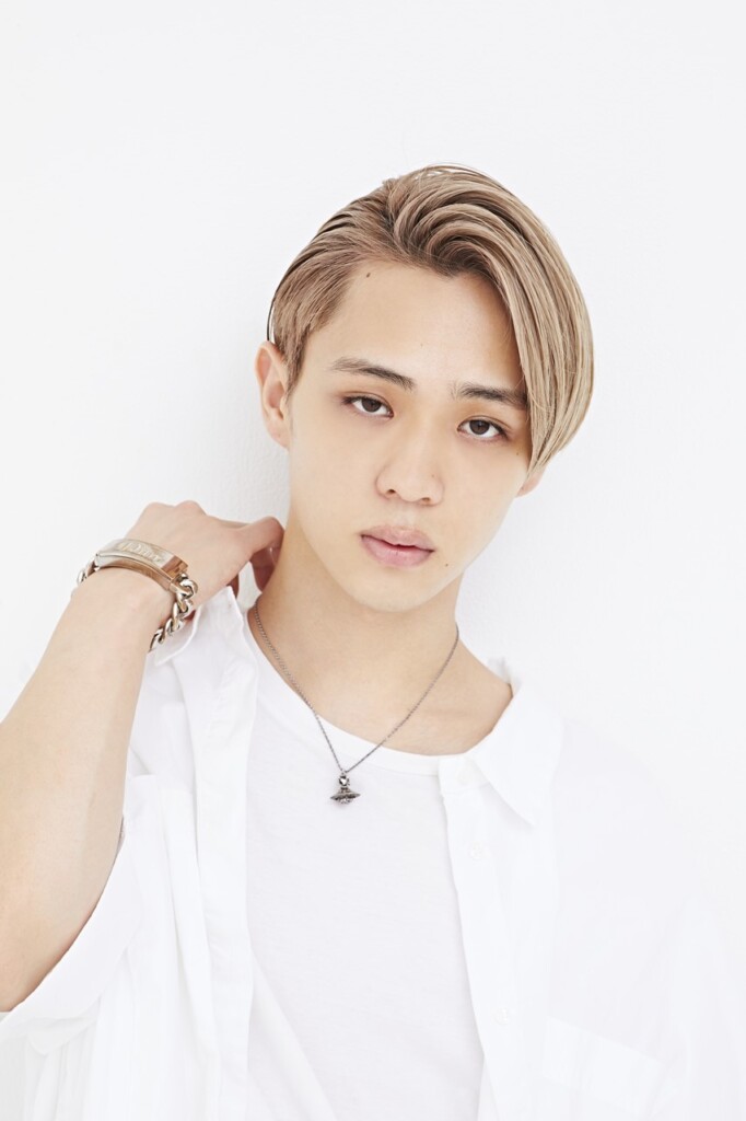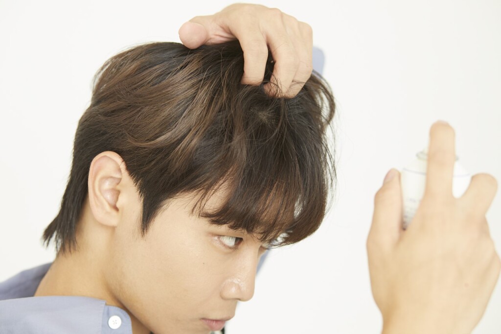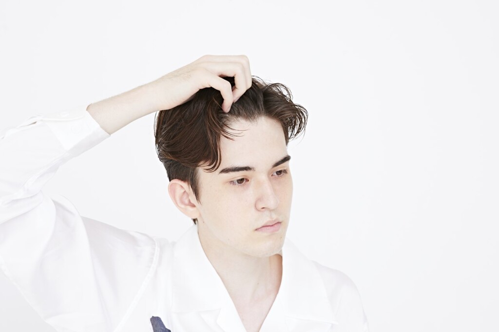 人気のハイトーンはセンターパートベースが好相性。長めのフロントは分け目を起こすように乾かして、毛先はコンマヘアになるように調整。オイルを塗布しセンターで分けたら、ふくらみやすいハチまわりを抑える。トップには高さを出して好バランスに。