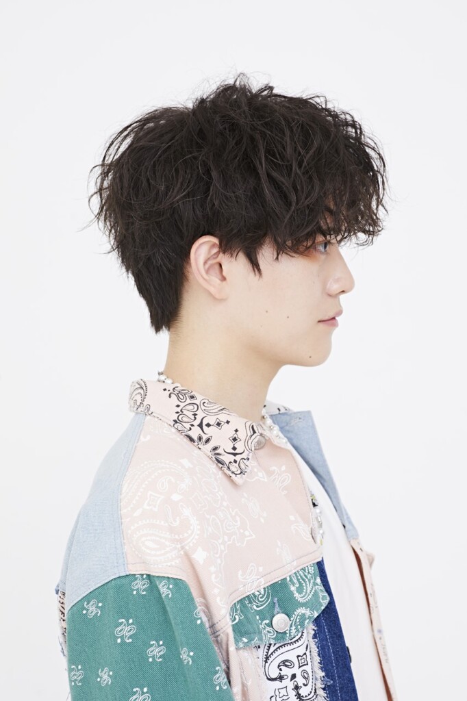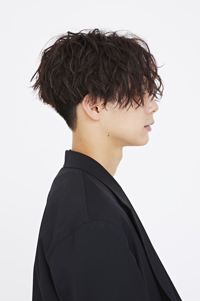 ボリューム感のあるスパイラルパーマでムーディに。ミディアムハードワックスを散らしながらなじませる。バングはセンターパートにし、バングのウェーブ感が一番強くなるようしっかり握りこむ。毛束が目元で揺れ動くように束感を調整し、エアリーな質感を引き出す。