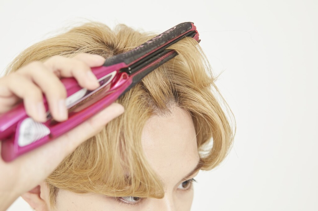 大人気の韓国ヘアといえば、カルマヘア。まわりのみんなと差をつけるならブロンドで攻める手もアリ。前髪のふわりとした動きはアイロンでリバースにクセづけることで簡単にメイク。パート部分を3パネルに分けてアイロンをスルー。アイロンは細めのプレートが◎。1・2・3のリズムで根元から毛先まで。最後にシアバターを全体にもみ込む。