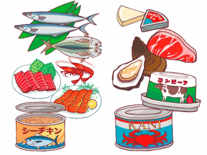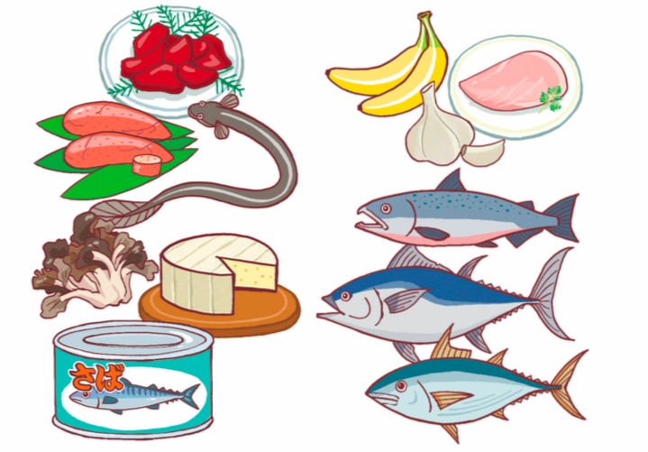 硫黄|ツナ缶、サケ(スモークサーモンなど)、カツオ、サンマ、アジ、鶏ささ身、エビ etc.