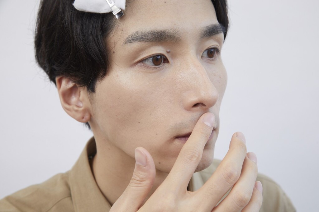 ヒゲが濃い部分はしっかり剃ったつもりでも青く見えてしまいます。なのでコンシーラーは青の反対色であるオレンジ系を選ぶと青みを消すことができます。ヒゲはニキビ跡やクマと違って凹凸があるので、そこを平らにするように、「塗る」というよりも「埋める」感覚で、コンシーラーをのばしすぎずトントン置くようにするのがポイントです。