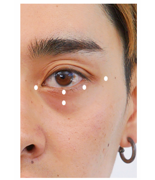 クマには「青クマ」「黒クマ」「茶クマ」があり、青クマはオレンジ系、黒クマはオークル系、茶クマはイエロー系のコンシーラーでカバーすると効果的。写真は代表的な青クマの解消に役立つツボです。人さし指の腹を使ってやさしく押しましょう。