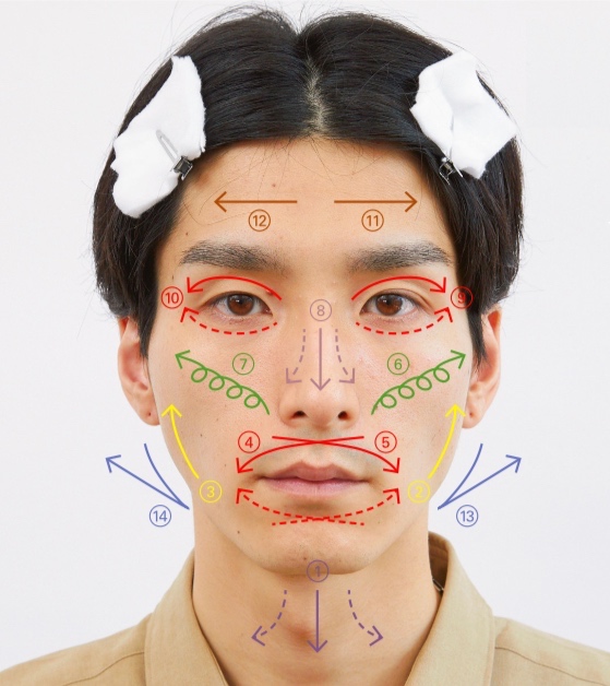 顔の皮膚は薄くてデリケート。マッサージの前には必ず乳液やクリームをつけて摩擦を抑えましょう。イラストの矢印のように、基本的には顔の内側から外側に向かってマッサージ。筋肉のこりやむくみを改善すれば輪郭が引き締まり小顔に見えます。