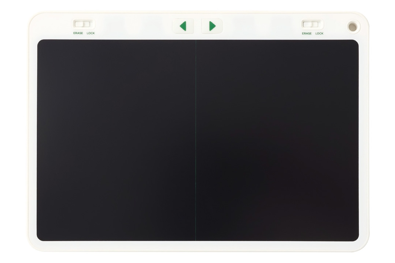 今回発売する「ブギーボード」BB-16は、シリーズ初の2分割画面を採用したモデル。それぞれの画面で書き込みと消去ができるので、各画面で別のメモを記入したり、対面での筆談時に質問欄と回答欄を分けて使用するなど、用途の幅が広がる。