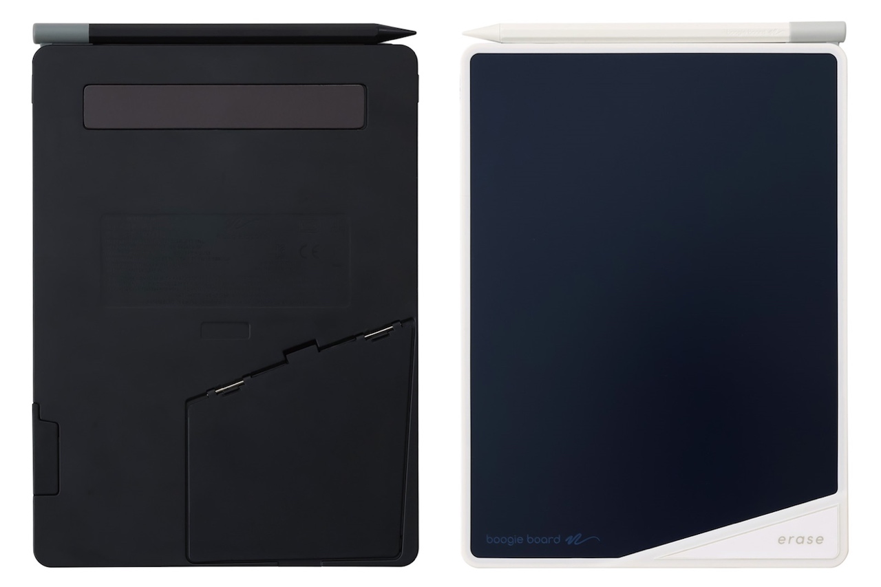 「ブギーボード」BB-17は、スリムフレームを採用したことにより筆記面積が増え、書きやすさや文字の見やすさを向上させたモデル。付属スタイラスのマグネット部分を本体右下に近づけるだけで画面を消去できる。