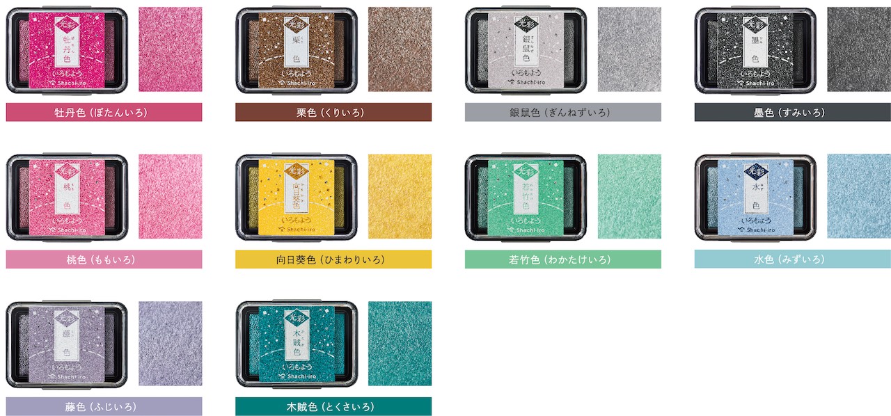 この度発売する「いろもよう 光彩」は、細かいキラキラした粒子によって、ほんのりキラめく色合いが特長のスタンプパッドだ。カラーバリエーションは、日本の伝統色から選定された全10色をご用意。細かな柄も、広い面も、思いのままに美しく表現できる。キラめく上品な光沢で、消しゴムはんこやゴム印での作品づくりをランクアップしてくれる。