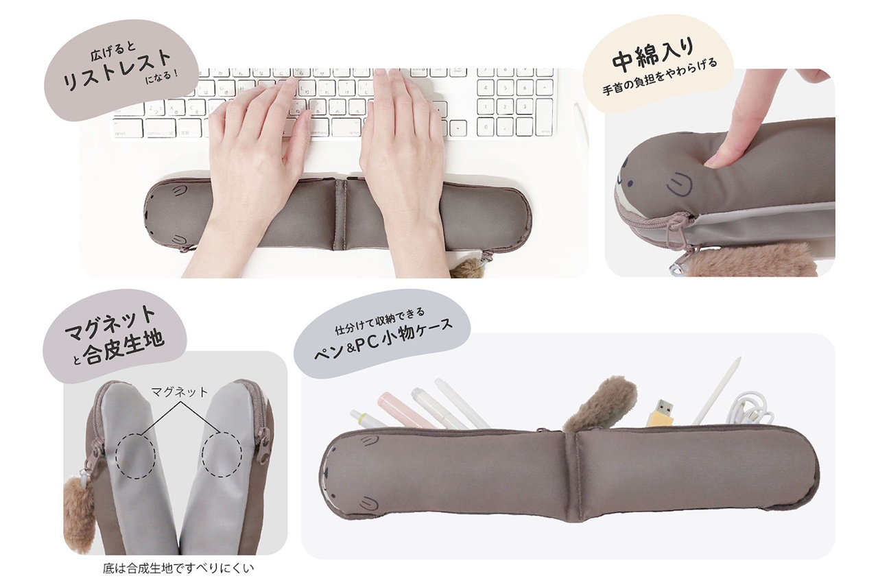 「リララ」は広げるとリストレストになる、綿入りクッション仕様。PC作業が増加するデスクワーク環境の中で、タイピングの際の手首の負担を軽減する。底は合皮生地を使用しているのですべりにくく、中綿や生地にこだわり収納スペースに物を入れた状態でも違和感のない快適な使い心地を実現。