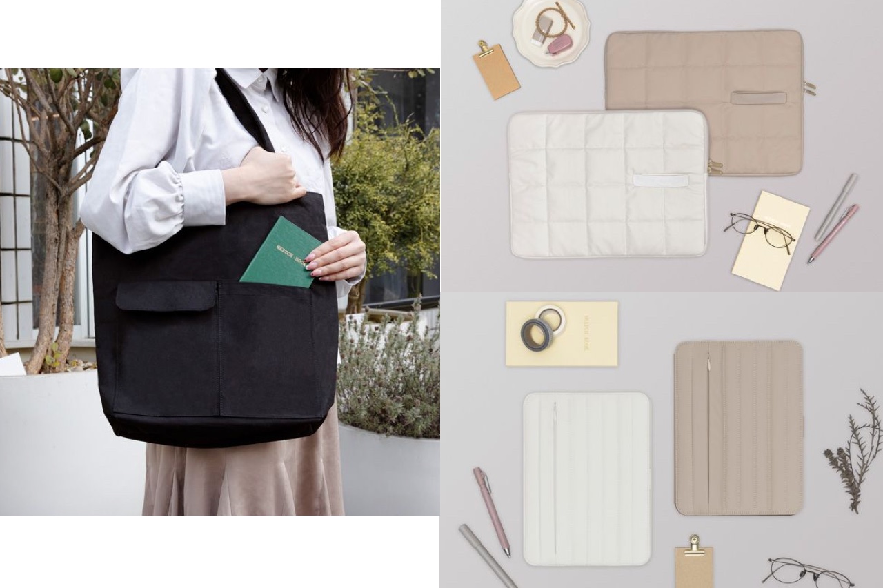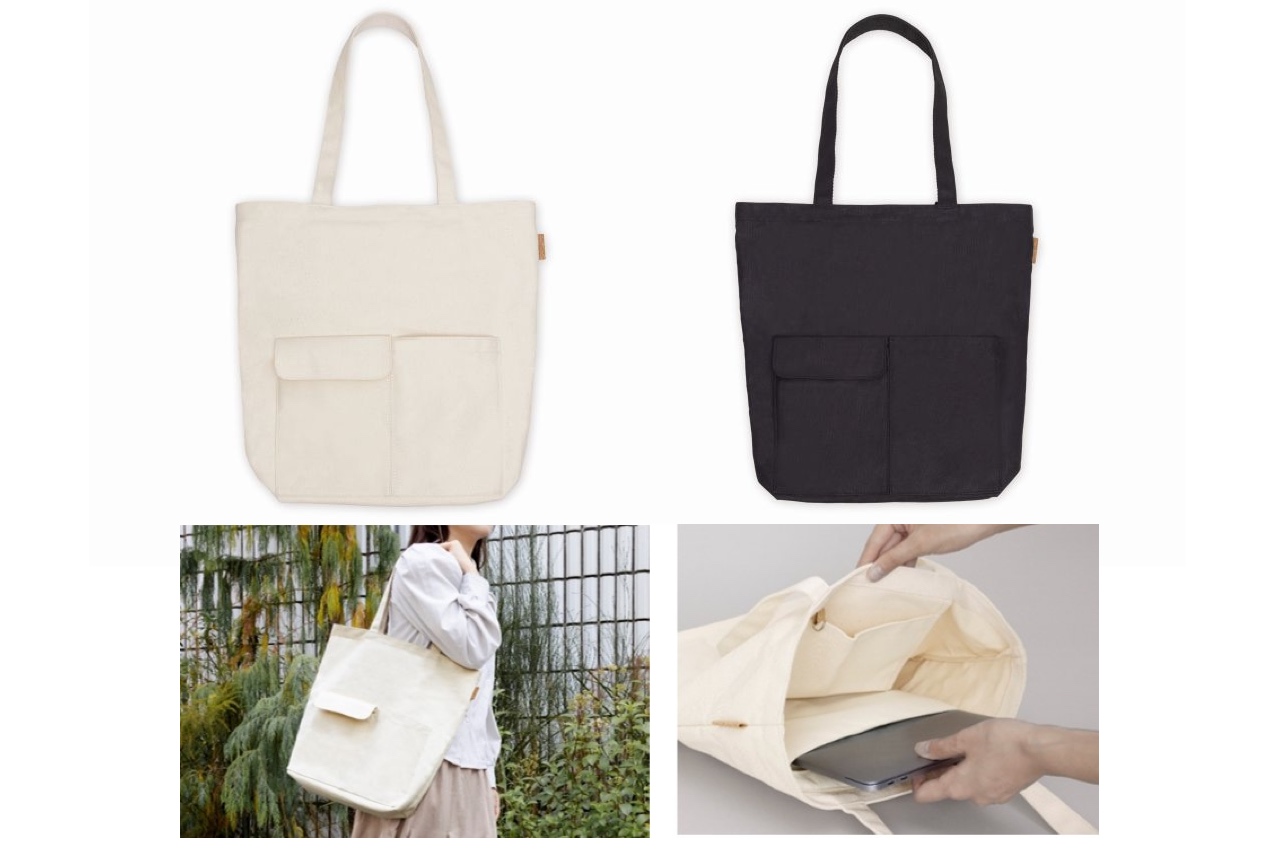 クッションポケット付きで、ケースに入れなくてもパソコンやタブレットを安心して持ち運ぶことができるトートバッグ。女子大生・女子高生の荷物量に合わせた丁度良いサイズ感を意識している。また、PCポケット以外にも、荷物を整理して入れられるポケットが外側に2つと内側に2つ、さらにペットボトルホルダーが付いており、バッグの中での持ち物の迷子を防ぐ。カラーは幅広いスタイルに馴染むようシンプルなクリームとブラックの2色を用意した。