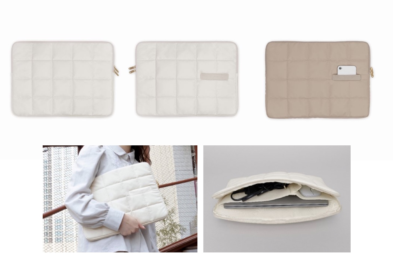 13インチノートパソコンと電源アダプター等のアクセサリーを整理して収容できる。外側に凸凹のないスッキリとしたデザインで、カバンからスムーズに出し入れ可能。生地には、大学生・高校生と一緒に選定したトレンド感のあるキルティングデザインを採用。外側にはスマートフォンを出し入れしやすいポケットがついている。カラーはクリームとベージュの2色を用意した。