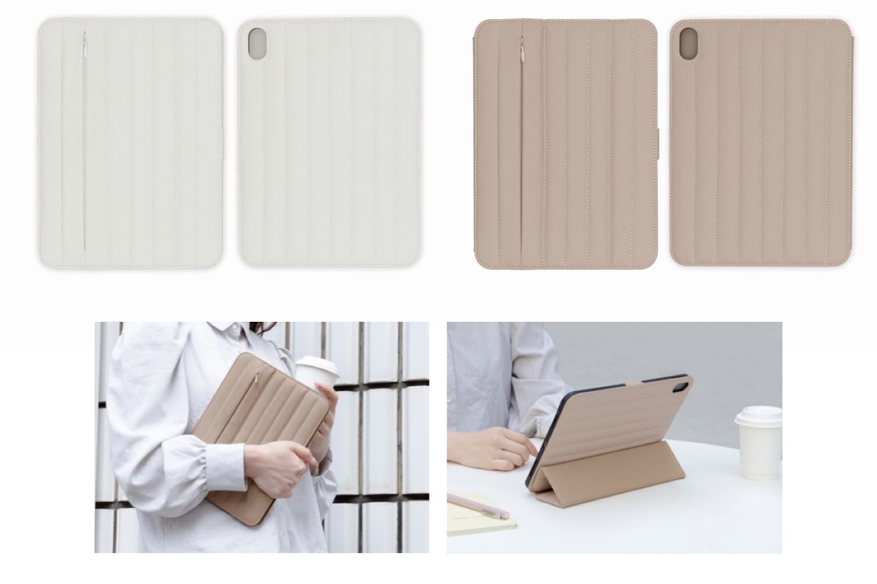 フラップを折りたたんでスタンドができるタブレットケース。シンプルな商品の多い一体型タブレットケースに、キルティングデザインをあしらうことで意匠性をプラス。タブレット付属のペンシルは、背面のチャック付きポケットに収容でき、紛失を防ぐ。カラーはPCケースとおそろいのクリームとベージュ。iPad第10世代とアップルペンシルが収容可能。