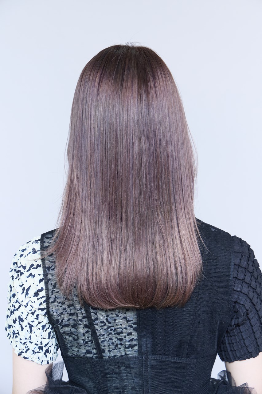 「今回提案させていただいたのは、個人的な推し色であるラベンダーグレージュ。根元から毛先にかけてのグラデーションカラーにし、上品な透明感が続く〈フレンチパール〉らしい仕上がりになったと思います。今、個人的に推すなら断然イノアの「モカラベージュ(82)」。最近のラベンダー系で(求める色味の配合が)1本で決まるカラー剤がなかなかないので、「モカラベージュ(82)」はすごくいいと思いますし、色にトレンド感がありますよね。ラベンダー系のカラーは美容師が失敗しにくい=どんな美容師でもうまくいくカラーだと思います。僕は補色にピンクを入れるのがお気に入りですが、それはくすみすぎずによりツヤ感が出せるから。アンダーのベースが16レベル以下なら入れなくてもいいと思いますが、ハイトーンのベースにはピンクの補色はおすすめです」(磯田さん)