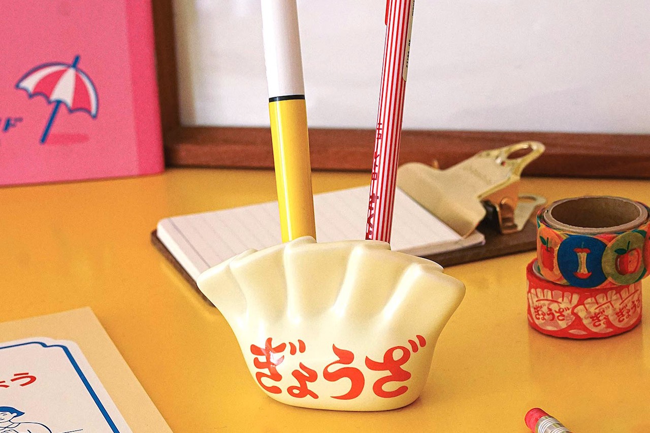 いつものペンをこれに挿すだけでデスク周りが楽しい雰囲気に! 出来たての餃子を彷彿とさせる磁器製ならではの艶感と、前面に入った「ぎょうざ」の力強いフォントがポイント!