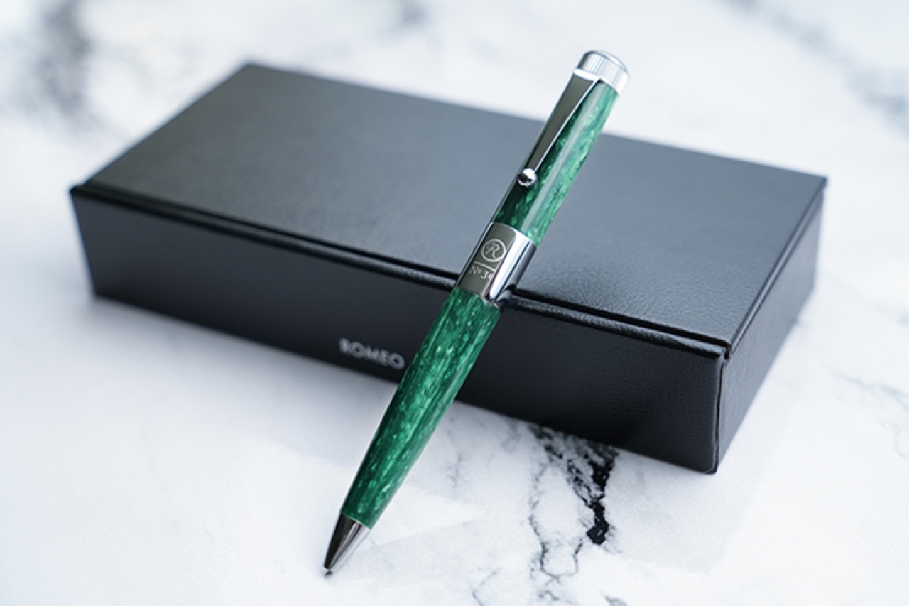 まだ見ぬ〈ROMEO〉の世界を予感させるエレメントの記号(∈)が刻まれた胴軸や、ひとつひとつ異なるアクリルボディの模様、3種の金属トリムとの組み合わせなど、オリジナリティと希少性の高いコレクションアイテムだ。