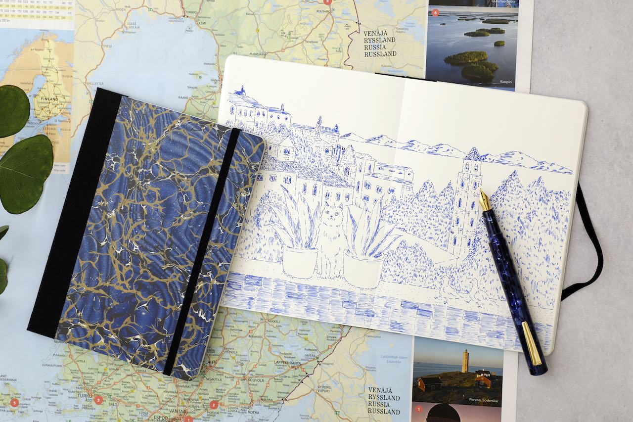 同シリーズの「レタープレスメモパッド A6/A5」と同じく、表紙には1880年代のマーブルペーパーのデザインを採用。布クロスの背テープとシンプルなハードカバーの装丁にはゴムバンドが付属し、外出時も手軽に持ち運べるB6サイズとなっている。机上での使用はもちろん、外出時のスケッチのお供にぜひ。