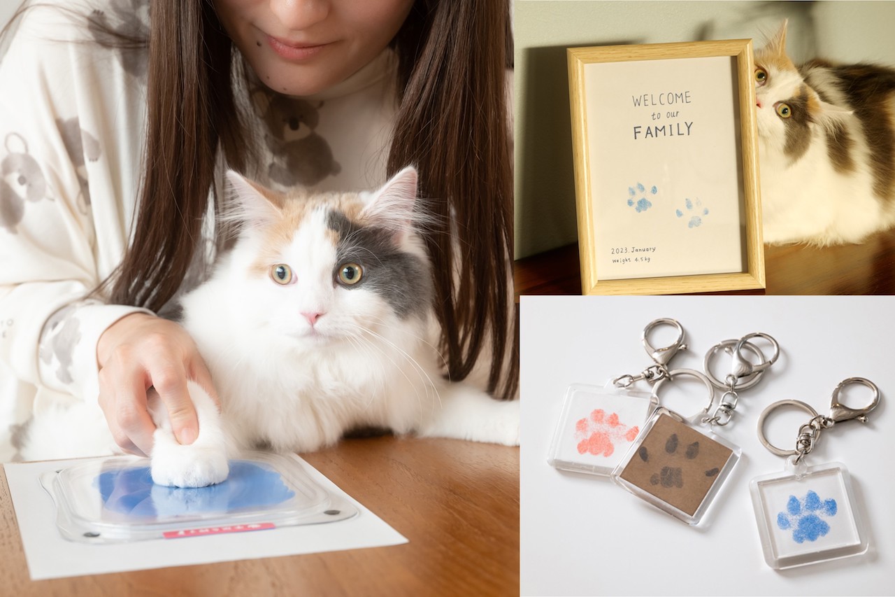 「ぺたっち 犬猫用」は、インキを直接肉球に付けるのではなく、インキが下に塗られたフィルムの上から足形を押すことで、直接インキに触れずに紙に足形を残せる。足にインキを塗らないので大切なペットやお部屋を汚す心配なく、思い出を彩る作品づくりを楽しむことができるのだ。