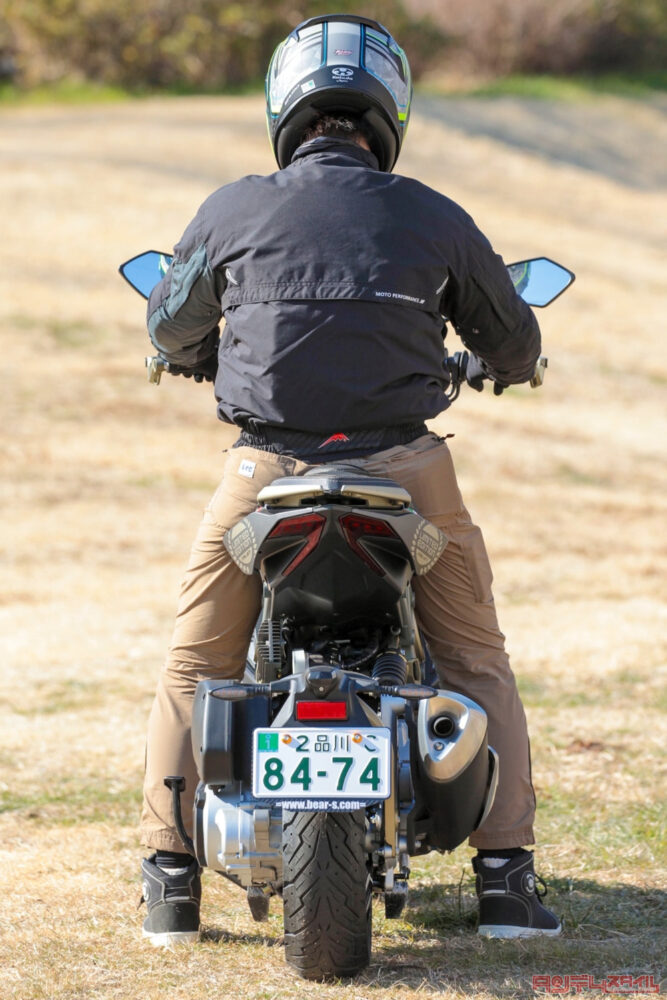 一般的な体格の成人男性によるタンデム走行も試みたが、ライダー側は運転に支障が出ることはなかった。ただしタンデマーはコンパクトなタンデムシートに座り続けることが大変で、それ以上に上体を支えるために手をかける場所の確保が難しかった。ということでタンデムはあくまでも緊急用の手段としておく方がいいだろう。