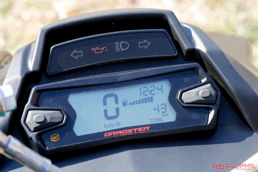 メーターはかなりコンパクトな液晶ディスプレイのみで、その上にインジケーターランプが並ぶ。速度・距離・燃料残量・時刻など表示される内容はシンプルだ。左右のボタンで操作する