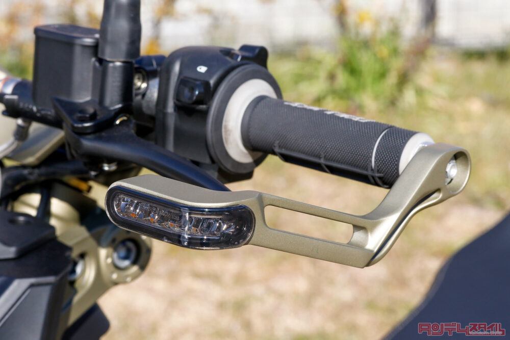 ハンドガードと一体型のウインカーはちょくちょく見かけるけれど、バーエンドからステーが伸びて支持されるウインカーはめずらしい。点滅のし方はシーケンシャルと今時である