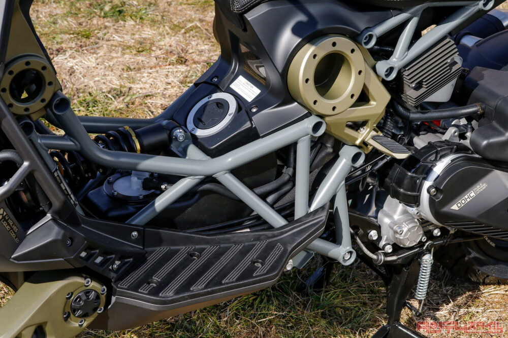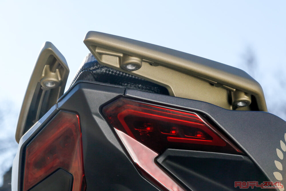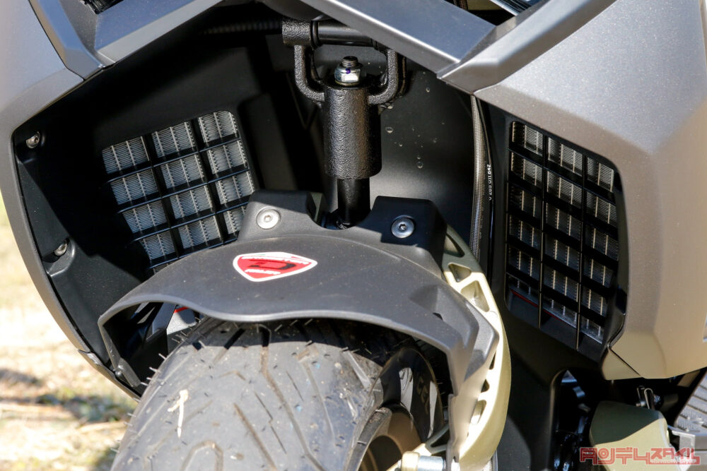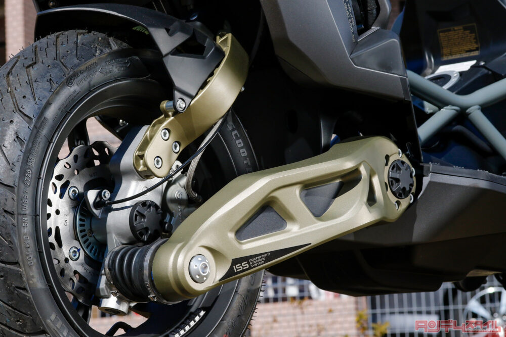 インディペンデント・ステアリング・システムと名付けられたハブセンター・ステアリング機構は、初代モデルから引き継がれたもの。スイングアームの造形が凝っているのも◎