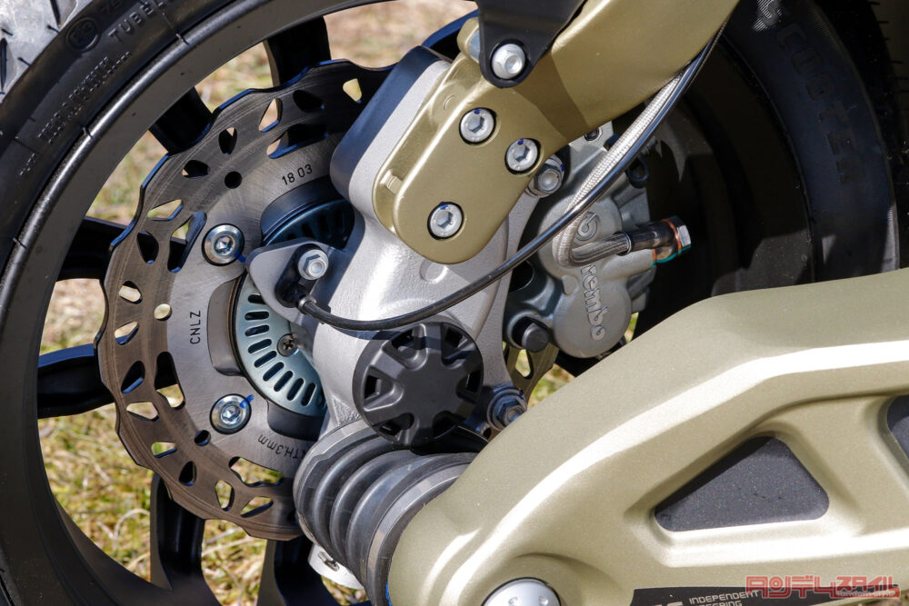 フロントブレーキのディスクローターはφ200mm の厚さ3mm で、ペータル形状となる。キャリパーのブレンボロゴとステンメッシュのホースがスポーティさをアピールする