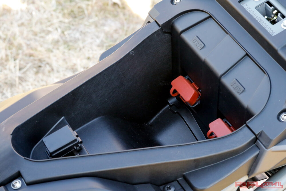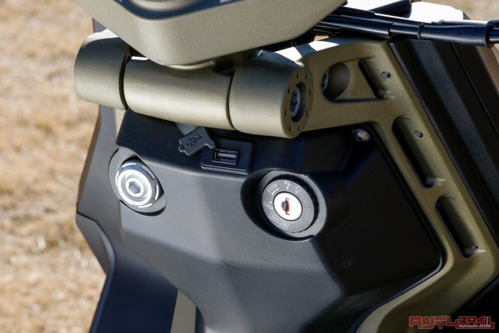 ハンドルの下には、メインキーシリンダー、冷却水の吸水口、USB の充電ソケットが並ぶ。スクーターにとって一般的なグローブボックスは装備されず、とてもシンプルな作り