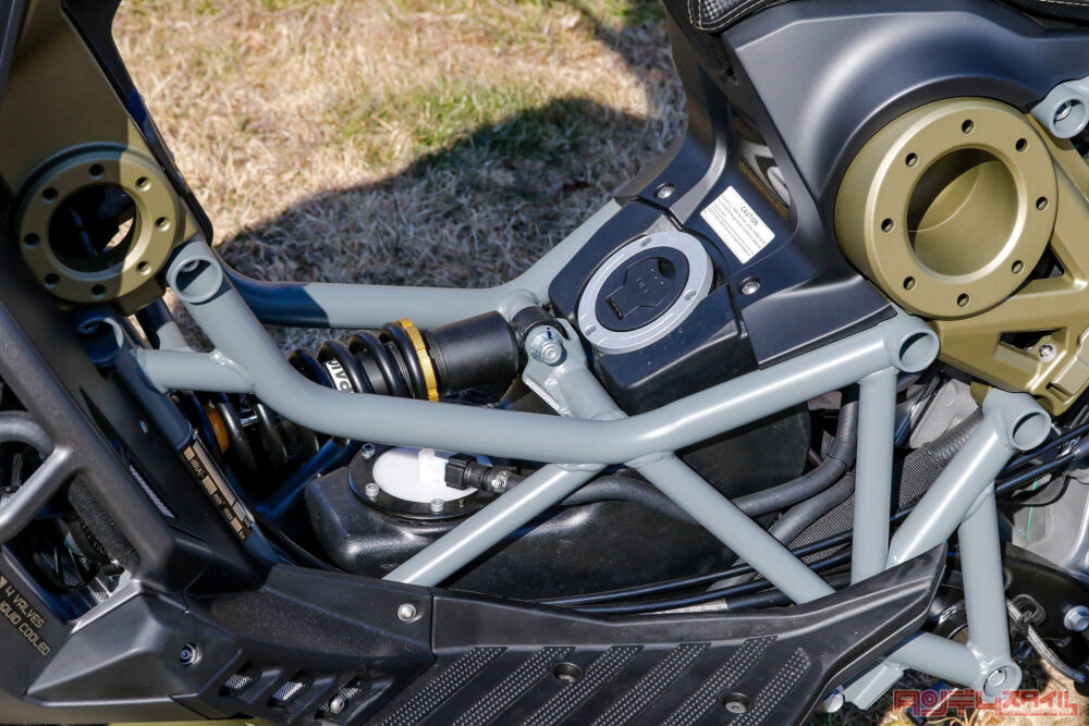 無骨なトラス構造のフレームがむき出しとなるセンタートンネル。中央に配されたショックユニットはフロントサスペンションのモノ。その後ろがガソリンの給油口でガソリンタンクも丸見え