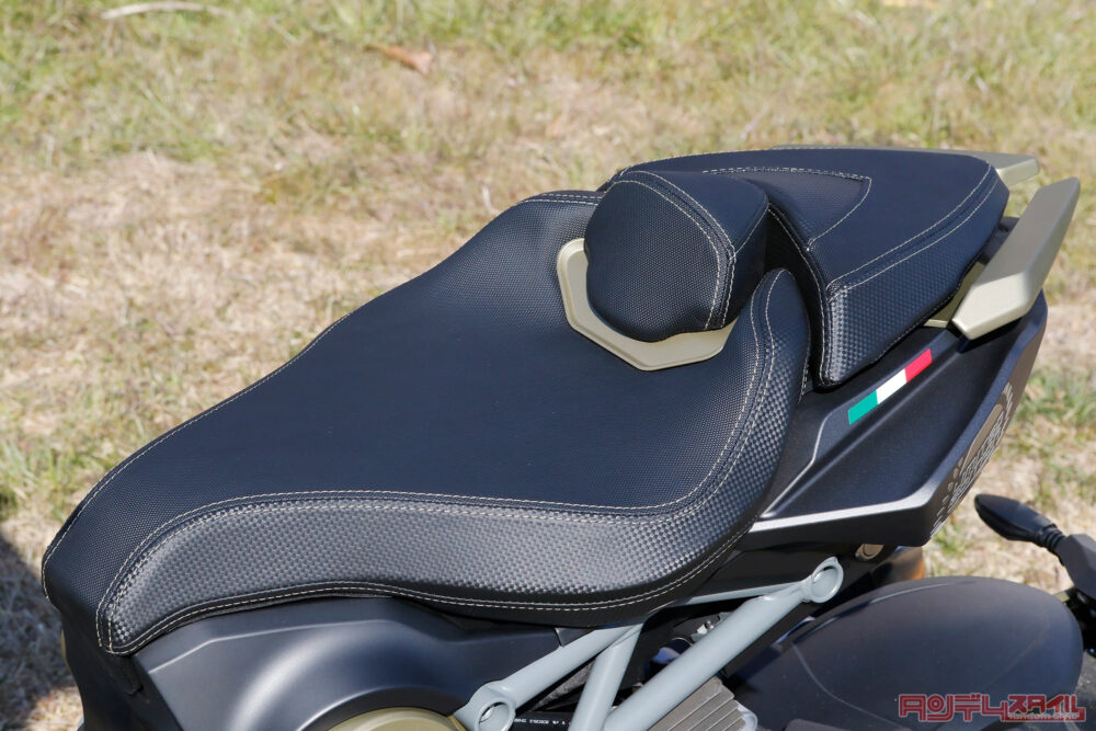 シートの表皮、形状ともにスーパースポーツに近い。実際にシートの上でお尻を動かしやすく、ポジションを作りやすい。あえて白いステッチを使っているあたりの演出が心にくい