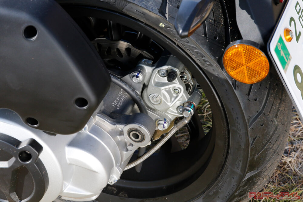 リヤブレーキはφ190mm のペータルディスクローターとブレンボ2 ポットキャリパーを組み合わせる。ステンメッシュホースによりタッチがカチッとしていてスポーツモデルらしい
