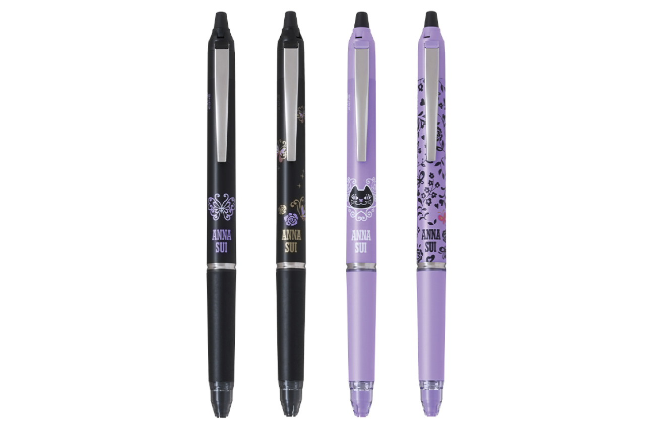 今回発売する『フリクションボールノックゾーン ANNA SUIコラボ』は、「ANNA SUI」の世界観に合わせた黒や紫のボディカラーをベースに、それぞれに人気のモチーフであるバタフライやローズ、ねこなどをあしらったデザインをラインアップ。ボール径は0.5mmの極細タイプだ。
