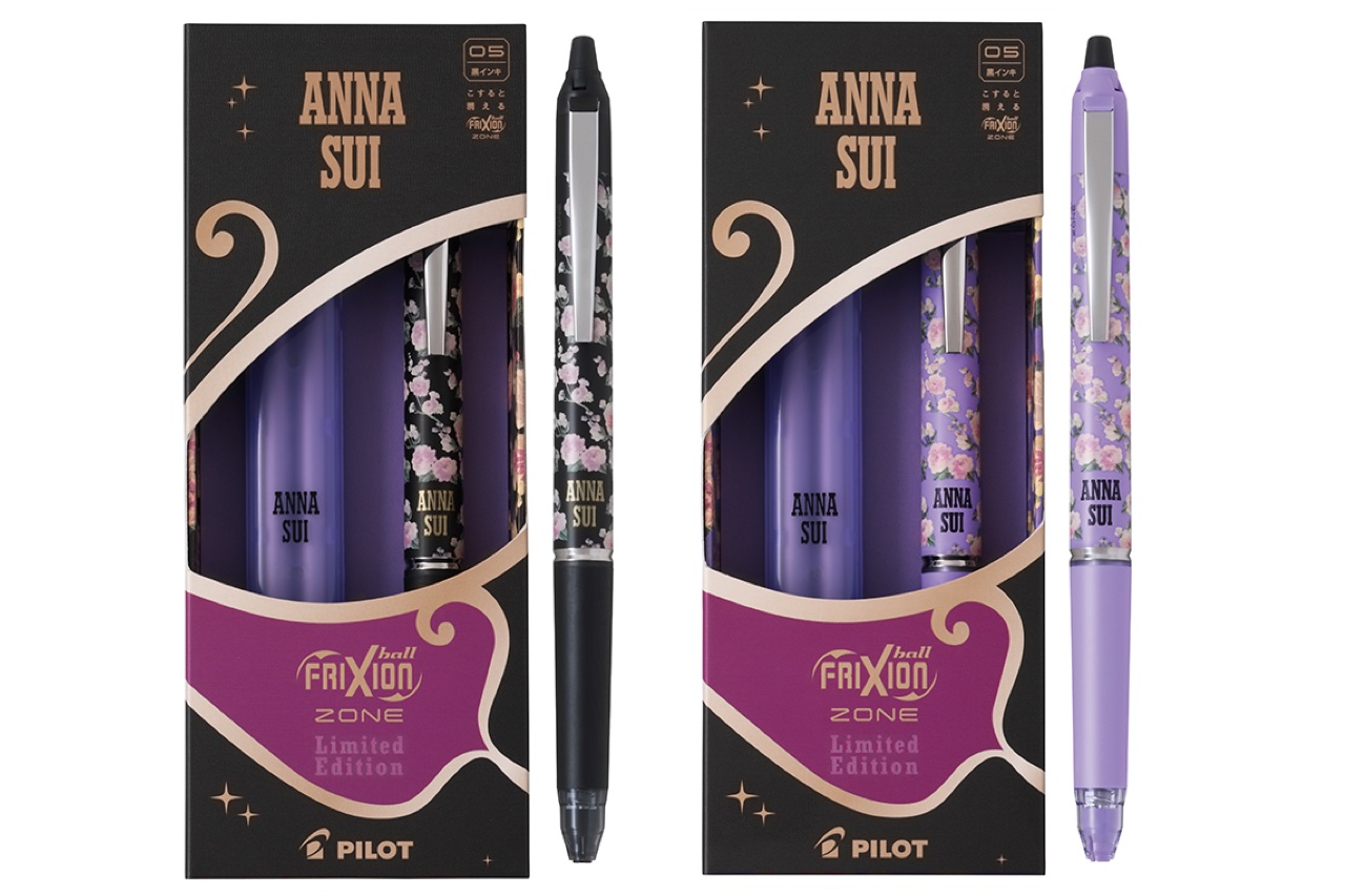 また、同時発売の『フリクションボールノックゾーン ANNA SUIコラボ ギフトセット』には、「ANNA SUI」の新作である2023年コレクションに登場したローズ柄を採用。黒や紫のボディをベースに鮮やかなピンクのバラがデザインされた華やかな1本に仕上げ、専用替芯「フリクションボールレフィルver.2」の黒が2本入ったロゴ入りのオリジナルレフィルケースが付属する。