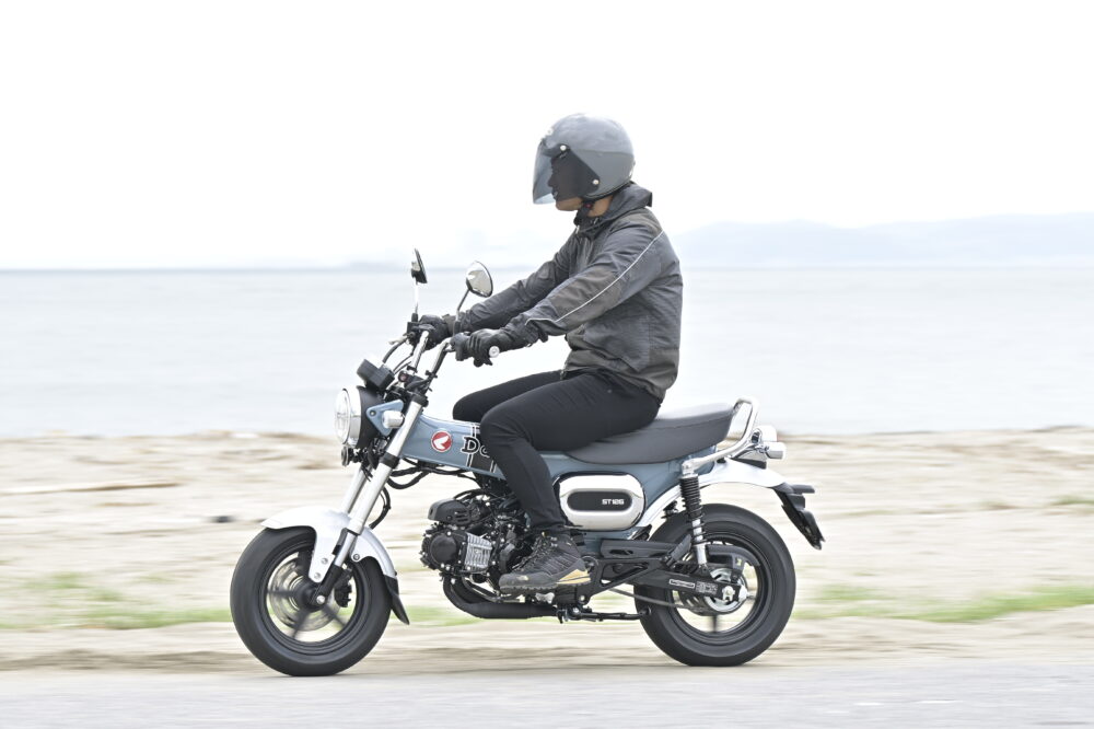 最初に気が付いたのはスタビリティのよさ。直進安定性がいい。速度を上げても路面のギャップやうねりが気にならない。ハンドルを保持することに集中しなくていい。12インチと小径ホイールといえるサイズながら外乱に強い。これは安全であるだけでなく、走るのがすごくラクになる。走行距離を伸ばしたい気持ちにさえなった。フロントまわりなどのセッティングはグロムのままだというが、ホイールベースをモンキー125より55mm長い1200mmにしたことに加えて、しっかりとした剛性の車体があり、その下で 前後のサスペンションがよく働いている。より排気量が大きいクラスのバイクのようなフィーリングがある。