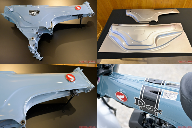 この新しいダックスがちゃんとダックスだと思わせるのは、スチールプレスフレームを 使ったからだ。笑いながらも「二度とやりたくありません」と開発に携わった人がいうほど苦労したが、開発初期からアイデンティティとして大切にし、コストや生産のことをクリアしながら情熱を込めて実現したことに拍手を送りたい。これじゃなきゃ絵に描いた餅 みたいな気持ちがどこかに残ったかもしれない。機能とスタイルを両立させた構成だけで なく、新しい人にはそのマテリアル感が新鮮であり、古い人にはノスタルジック。これがダックス125のスタイルであり、ハートだ。
