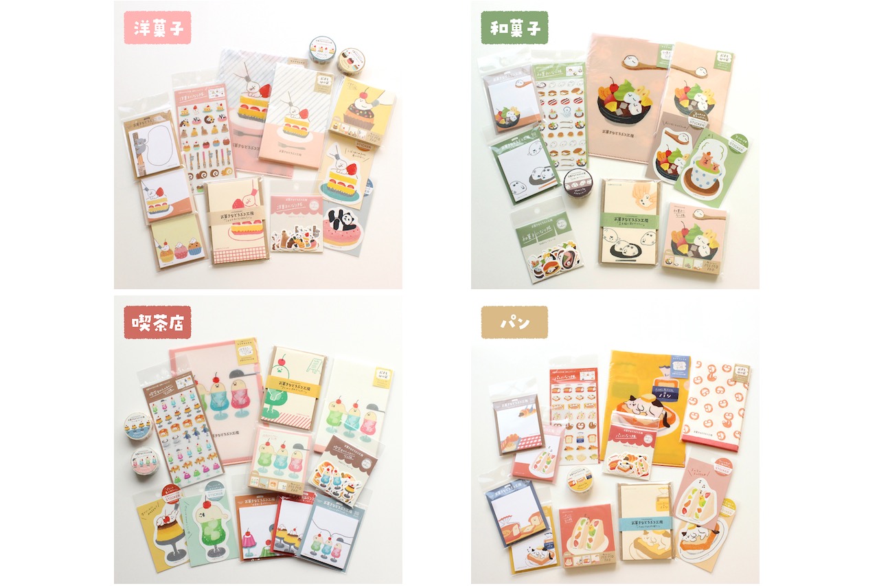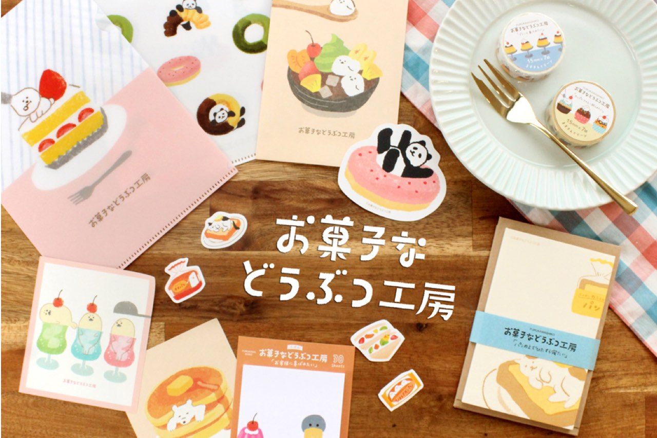 お菓子になりすましたどうぶつたちの小さなお菓子工房をイメージした新シリーズ。クリームソーダのふりをしたアザラシやフルーツサンドに挟まれたインコなど、見ているだけで癒されるほっこりしたイラストが特徴。人気のメモパッドや和紙フレークシールはもちろん、ひとことメッセージを添えるのにぴったりな付箋もラインナップされている。