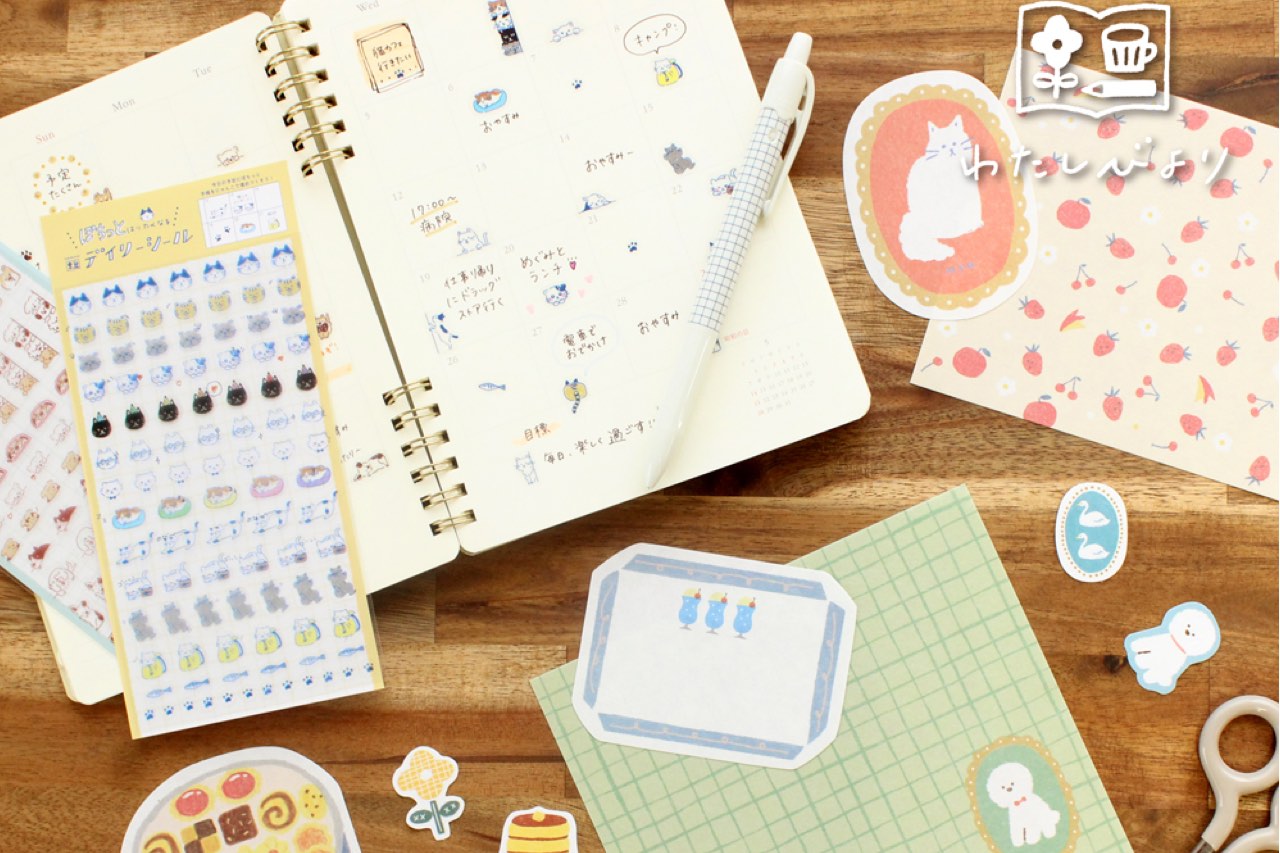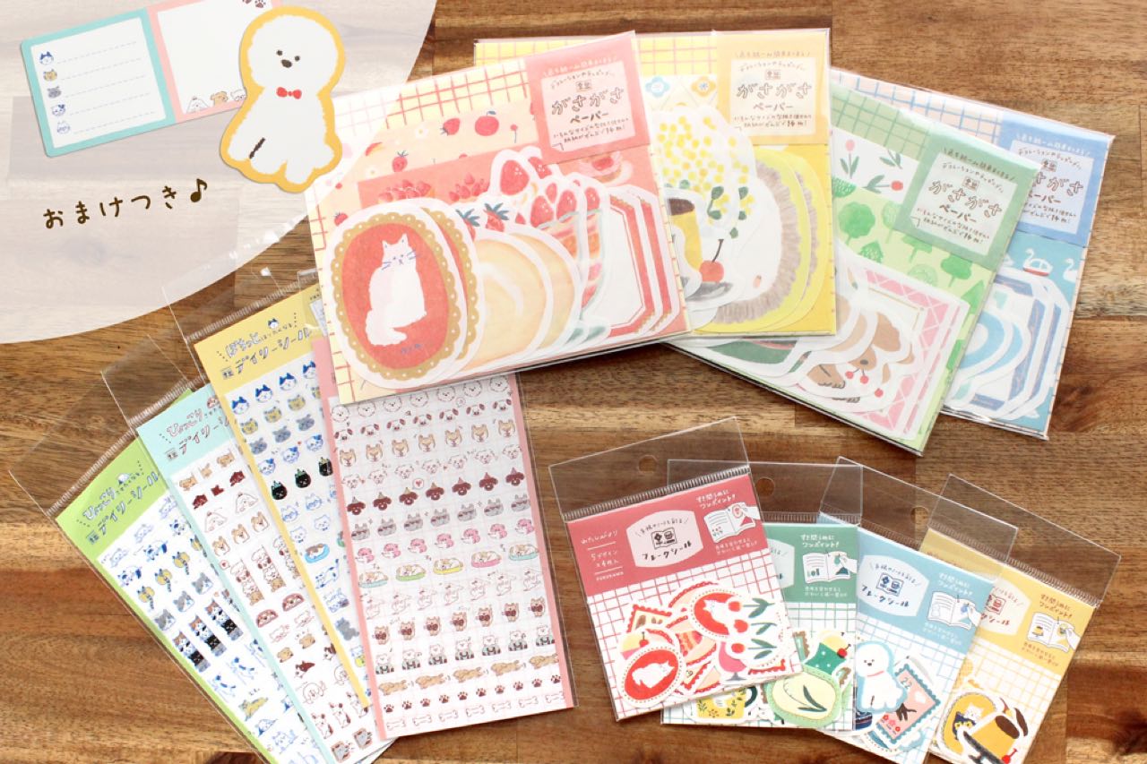 手帳を彩るわたしびよりシリーズから、手帳デコに使いやすい3アイテムが新たに登場。人気の「和紙フレークシール」や型抜きペーパーと四角ペーパーが合計14枚入った「がさがさペーパー」は、それぞれ色で統一されているので、初めての手帳デコにもピッタリな商品。また、「デイリーシール」は手帳のマンスリーページについつい貼りたくなるような犬猫のデザイン。