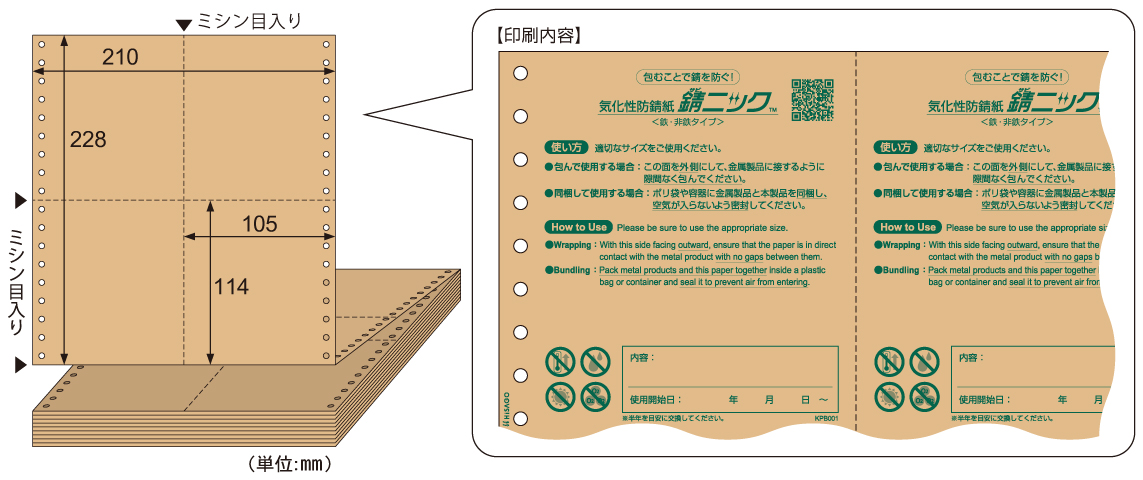 市場にある防錆紙は、様々なサイズのシートタイプと、大きなものを包めるロールタイプの2種に大別される。ヒサゴでは「サイズ違いのシートタイプを複数用意するコスト」「ロールタイプに発生するカールによる作業効率への影響」を使用シーンの困りごとと想定し、これらを解決すべく、伝票メーカーとして半世紀以上培ってきたノウハウを活かして、防錆紙を連続帳票と同じ「じゃばら折り+ミシン目」が入った形状にした。