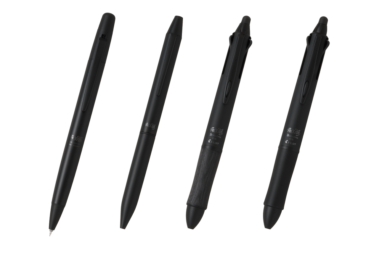 シリーズのラインアップは、消せるボールペン『フリクションポイントノックビズ フルブラック』、2色タイプの『フリクションボール2ビズ フルブラック』、3色タイプの『フリクションボール3ウッド フルブラック』と『フリクションボール3メタル フルブラック』の4アイテム。