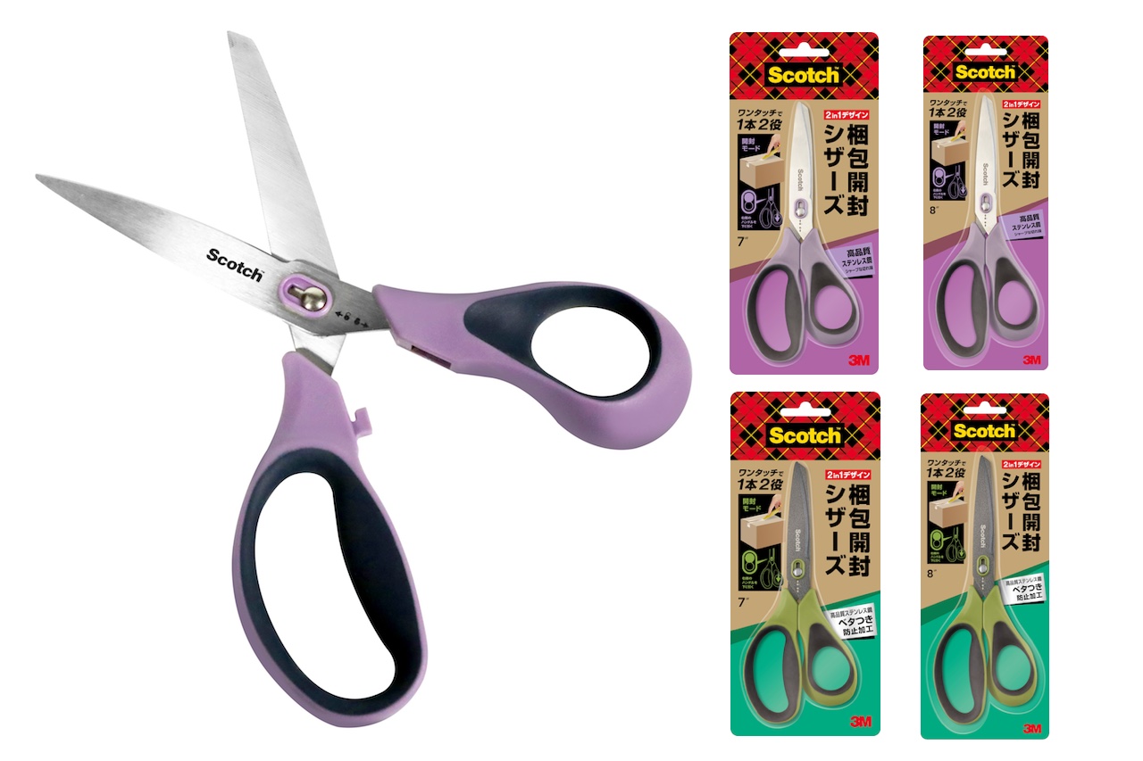 「スコッチ(TM) 梱包開封シザーズ」は、簡単ワンタッチでハサミとしても開梱用カッターとしても使える、1本2役の新しいコンセプトのハサミ。近年ネット通販の利用が増え、梱包・発送市場が拡大していることから、荷物を梱包・開封する際に便利なツールとして発売する。